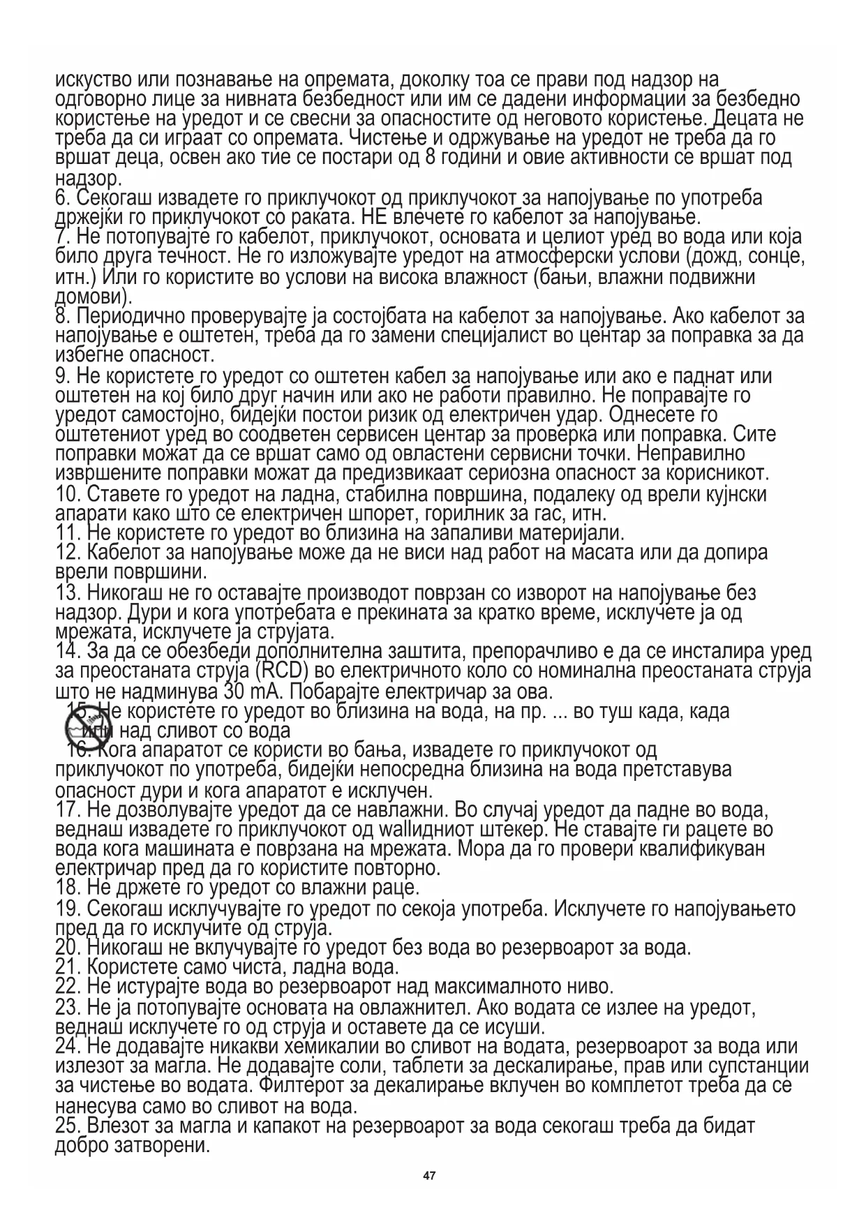 24. Не додавајте никакви хемикалии во сливот на водата, резервоарот за вода или