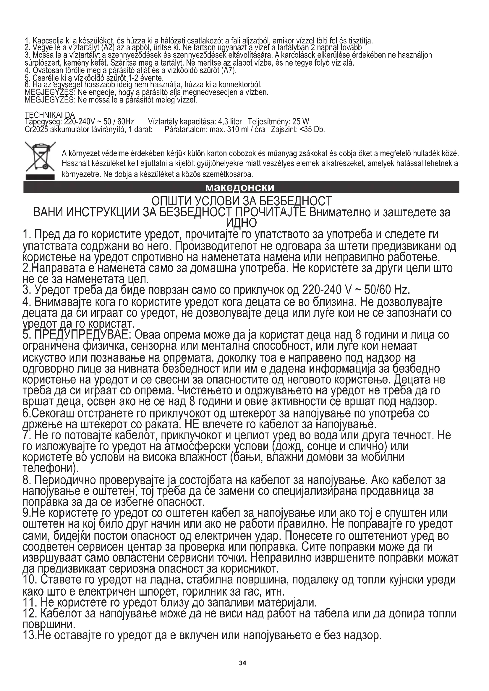 Белешка: Не дозволувајте основата на овлажнител да се навлажни во вода. ЗАБЕЛЕШКА: Не измивајте овлажнител со топла вода. ТЕХНИЧКИ ДА Напојување: 220-240V ~ 50 / 60Hz Капацитет на резервоарот за вода: 4,3 литри Mоќност: 25 W Далечински управувач на батериј ата CR2025 1 парче Капацитет на навлажнување: максимум 310 ml / час Ниво на бучава: <35 Db.37 За да се заштитат вашата околина: ве молиме одделни кутии и пластични кеси и да располага со нив во соодветните канти за отпадоци. Користи апаратот треба да биде предаден на посветен собирање поени поради hazarsous компоненти, кои можат да влијаат на животната средина. Не фрлајте овој апарат во заедничката корпа за отпадоци.