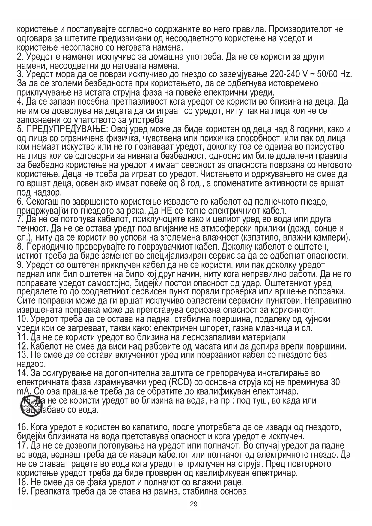 15. Да не се користи уредот во близина на вода, на пр.: под туш, во када или