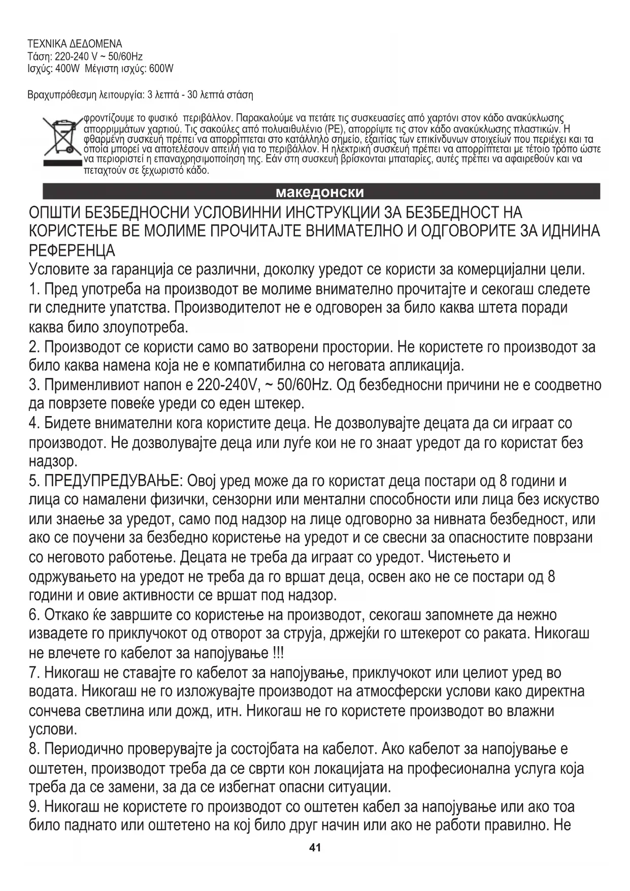 7. Обезбојувањето на пластиката може да се случи со силно обоени овошја и зеленчук. За да се спречи ова, веднаш измијте ги деловите по употреба. 8. Ако се појави промена на бојата, пластичните делови може да се потопат во 10% сок од лимон и вода или може да се исчистат со абразивен чистач. За да се помогне при чистење, натопете ја кошницата од филтерот од нерѓосувачки челик (9) во врела вода за сапуница околу 10 минути веднаш по завршувањето на сокот. Ако пулпата остави да се исуши на филтерот, може да ги заглави фините пори на филтерната мрежа, со што се намалува ефикасноста на соковникот. За ваше погодување четка за најлон е вклучена со вашиот соковник. Краткорочно работење: 3 мин. - 30 мин ТЕХНИЧКИ ПОДАТОЦИ Напон: 220-240 V ~ 50/60Hz Моќност: 400W MAX моќност: 600W ЗАБЕЛЕШКА: Бананите не се погодни за соковници поради начинот на кој плодот е структуриран. Се грижиме за природната средина. Картонските паковки молиме да се наменат за рециклирање. Полиетиленовите кеси (PE) да се фрлат во контењер за пластика. Искористениот уред треба да се предаде во соодветниот складирачки пункт, бидејќи небезбедните состојки кои се наоѓаат во уредот можат да бидат загрозување за средината. Електричниот уред треба да се предаде на начин кој ќе оневозможи негова повторна употреба и искористување. Доколку во уредот има батерии, треба да се извадат и посебно да се предадат во складирачкиот пункт. ČESKY VŠEOBECNÉ BEZPEČNOSTNÍ PODMÍNKYDŮLEŽITÉ POKYNY K BEZPEČNOSTI POUŽITÍ PROSÍM SI PŘEČTĚTE SI A UCHOVÁVEJTE PRO BUDOUCÍ REFERENCE Záruční podmínky se liší, pokud je zařízení používáno pro komerční účely.