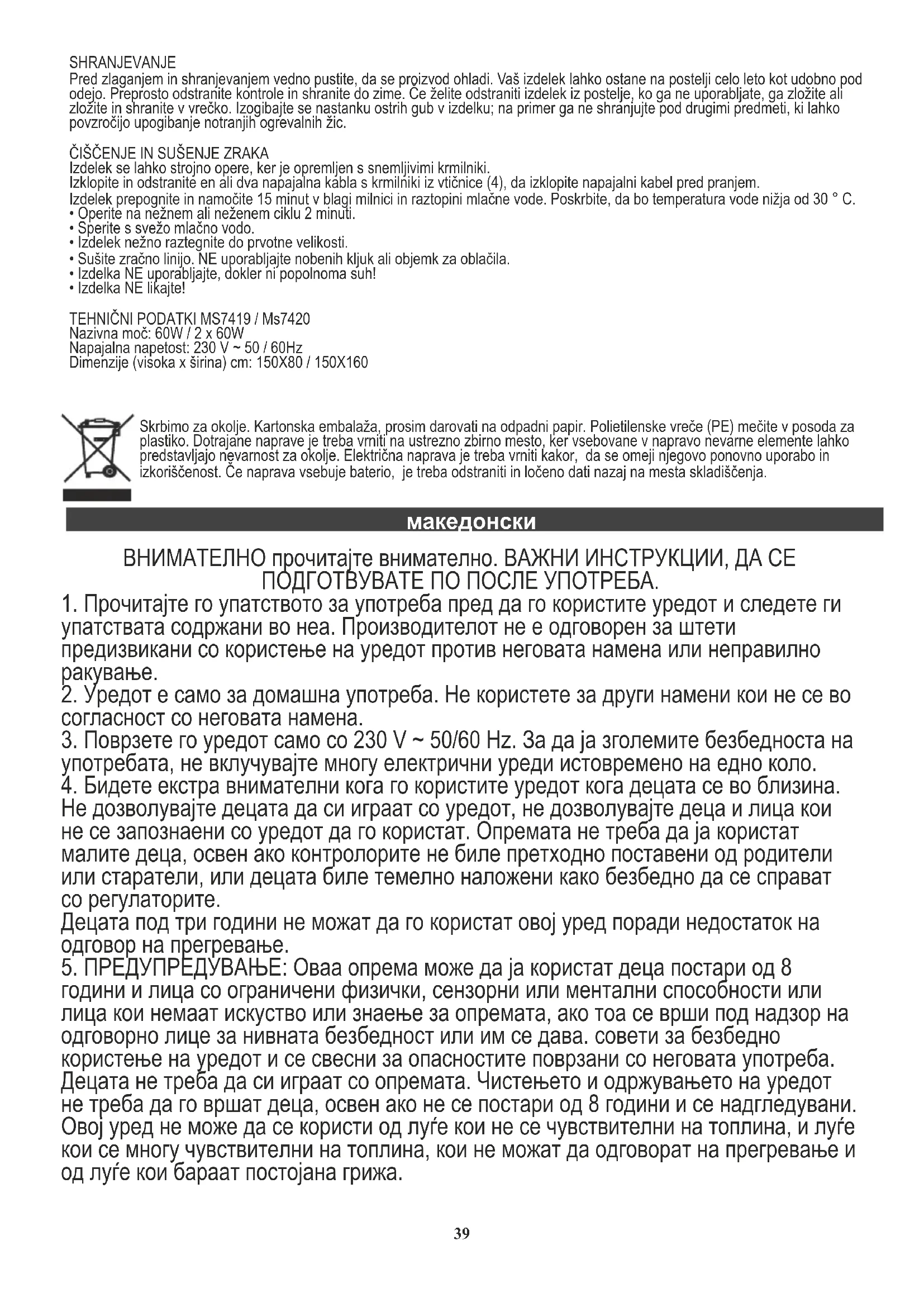 работи кога се користи во согласност со планираната употреба на опремата. Доколку прекинувачот се исклучи, уредот ќе престане да работи, опремата мора да се врати на производителот или неговиот претставник за поправка. Izdelek: Električna podloga MS7419 / Ms7420 ПРЕД ПРВАТА УПОТРЕБА