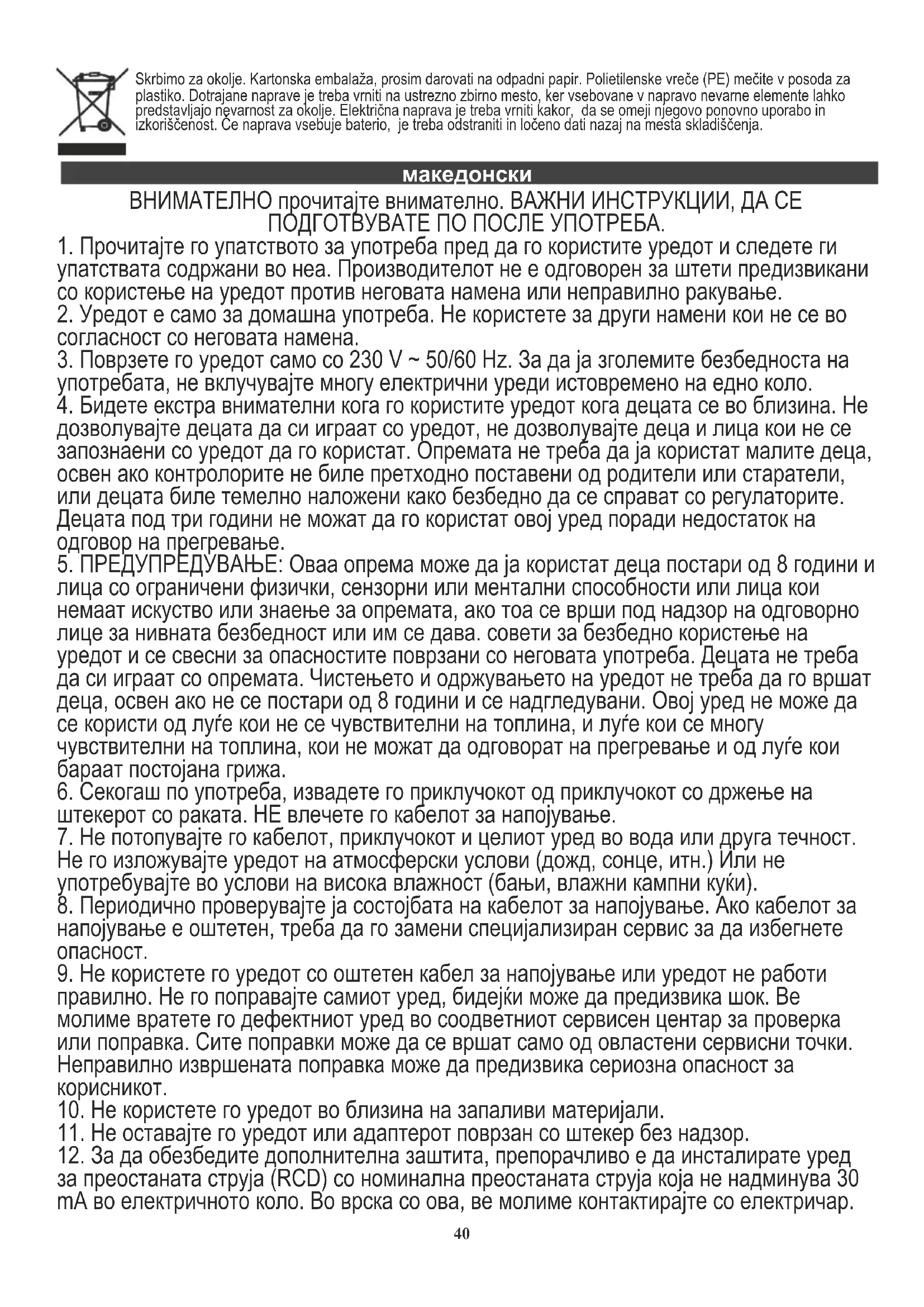 namjenom. Се грижиме за природната средина. Картонските паковки молиме да се наменат за рециклирање. Полиетиленовите кеси (PE) да се фрлат во контењер за пластика. Искористениот уред треба да се предаде во соодветниот складирачки пункт, бидејќи небезбедните состојки кои се наоѓаат во уредот можат да бидат загрозување за средината. Електричниот уред треба да се предаде на начин кој ќе оневозможи негова повторна употреба и искористување. Доколку во уредот има батерии, треба да се извадат и посебно да се предадат во складирачкиот пункт.