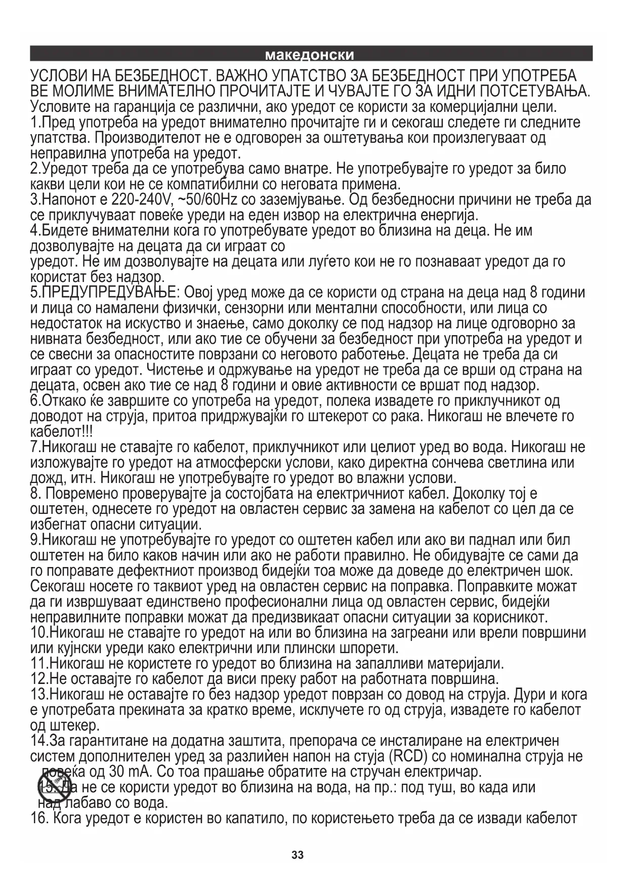4.Бидете внимателни кога го употребувате уредот во близина на деца. Не им дозволувајте на децата да си играат со 7.Никогаш не ставајте го кабелот, приклучникот или целиот уред во вода. Никогаш не изложувајте го уредот на атмосферски услови, како директна сончева светлина или дожд, итн. Никогаш не употребувајте го уредот во влажни услови. 14.За гарантитане на додатна заштита, препорача се инсталиране на електричен систем дополнителен уред за разлиѝен напон на стуја (RCD) со номинална струја не повеќа од 30 mA. Со тоа прашање обратите на стручан електричар.