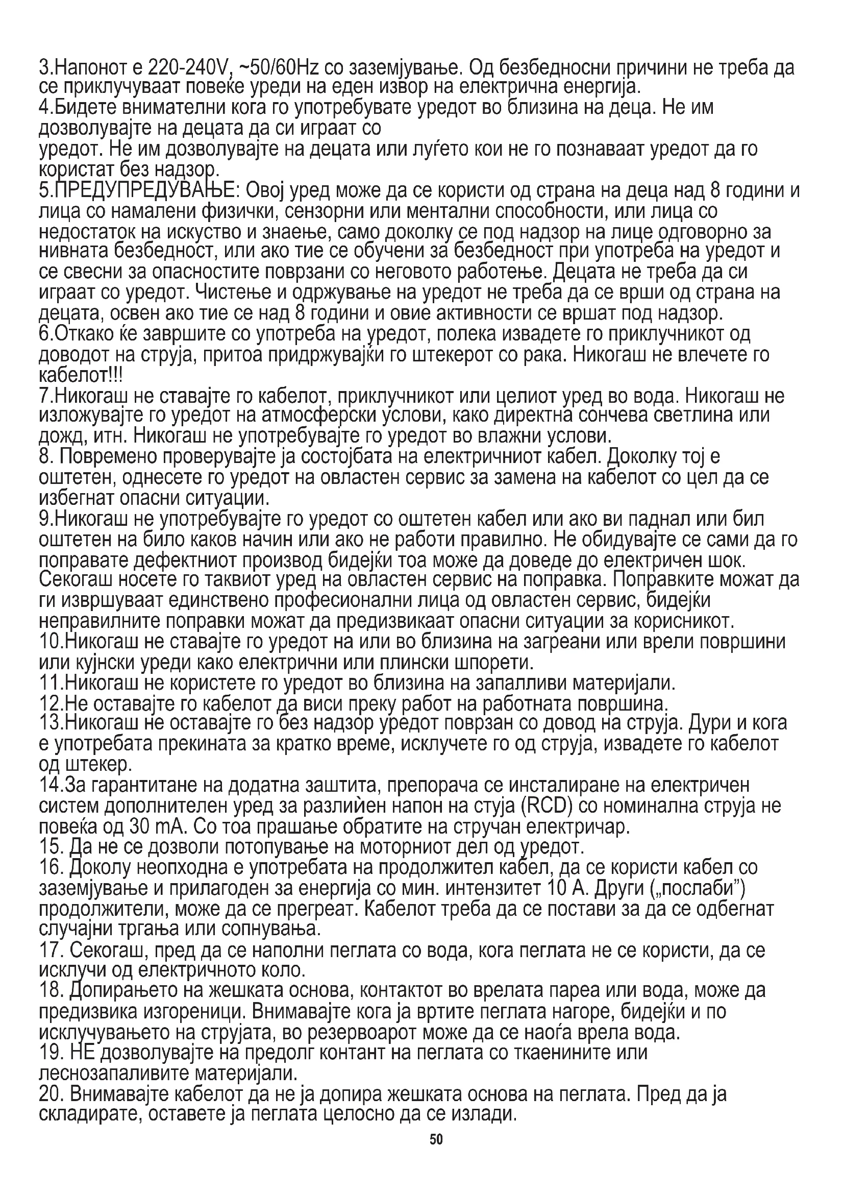 заземјување и прилагоден за енергија со мин. интензитет 10 А. Други („послаби”) продолжители, може да се прегреат. Кабелот треба да се постави за да се одбегнат случајни тргања или сопнувања. 4.Бидете внимателни кога го употребувате уредот во близина на деца. Не им дозволувајте на децата да си играат со 5.ПРЕДУПРЕДУВАЊЕ: Овој уред може да се користи од страна на деца над 8 години и лица со намалени физички, сензорни или ментални способности, или лица со недостаток на искуство и знаење, само доколку се под надзор на лице одговорно за нивната безбедност, или ако тие се обучени за безбедност при употреба на уредот и се свесни за опасностите поврзани со неговото работење. Децата не треба да си играат со уредот. Чистење и одржување на уредот не треба да се врши од страна на децата, освен ако тие се над 8 години и овие активности се вршат под надзор. 10.Никогаш не ставајте го уредот на или во близина на загреани или врели површини или кујнски уреди како електрични или плински шпорети. 11.Никогаш не користете го уредот во близина на запалливи материјали. 3.Напонот е 220-240V, ~50/60Hz со заземјување. Од безбедносни причини не треба да се приклучуваат повеќе уреди на еден извор на електрична енергија. 12.Не оставајте го кабелот да виси преку работ на работната површина.