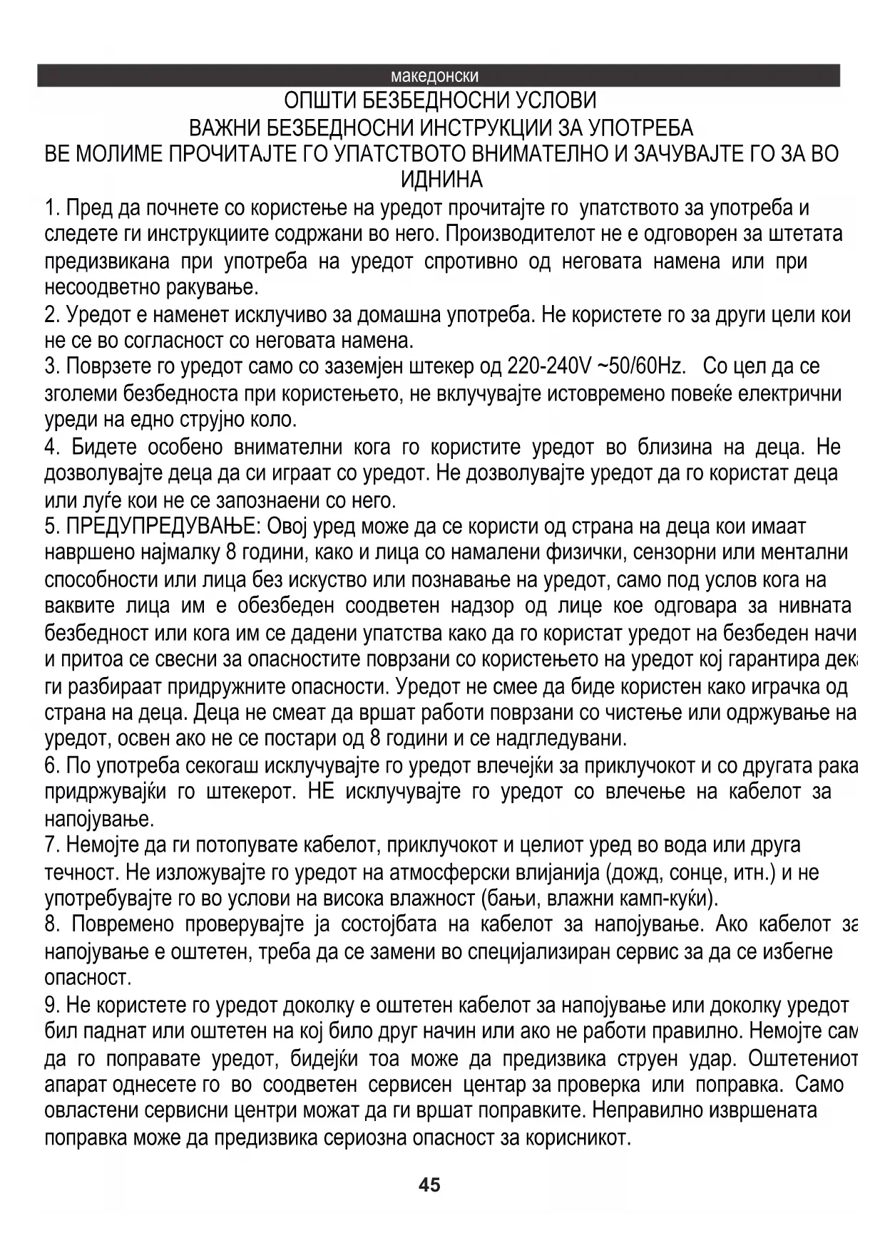 9. Не користете го уредот доколку е оштетен кабелот за напојување или доколку уредот