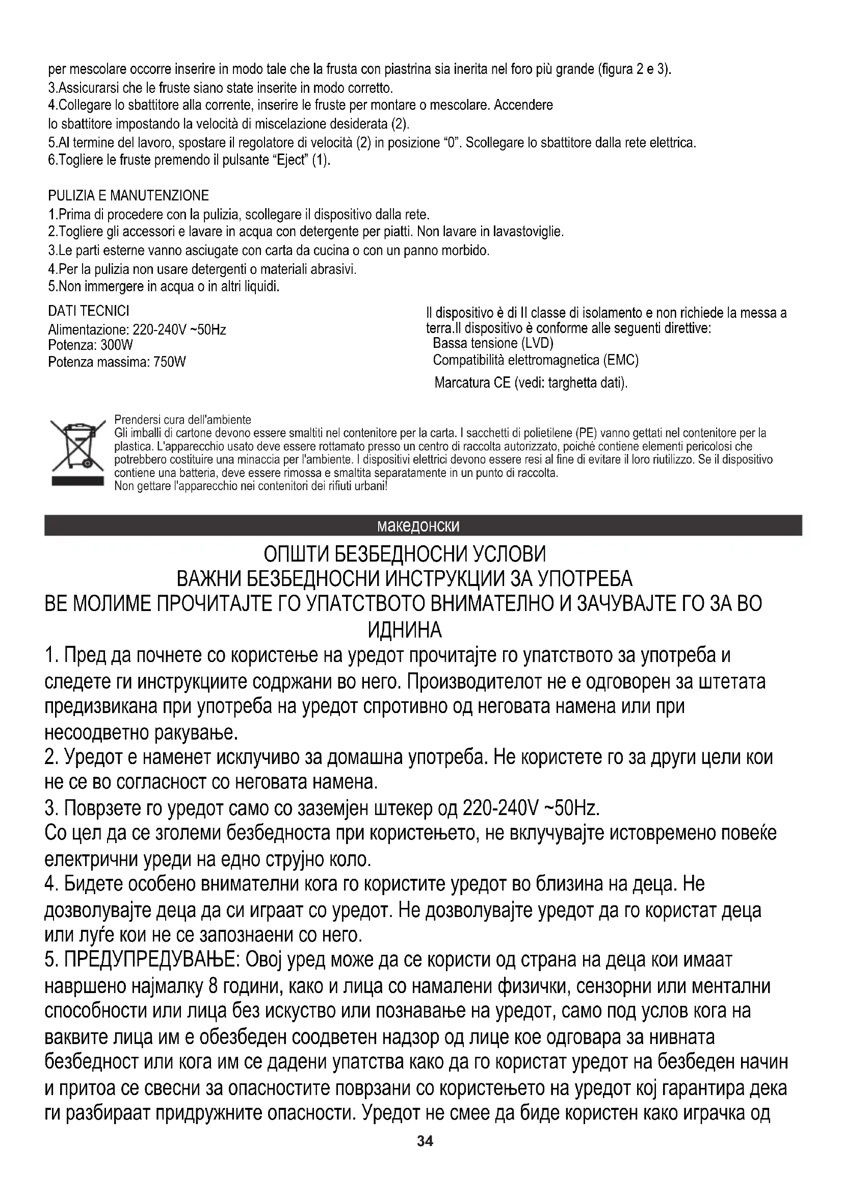3.Избришете ги надворешните делови со кујнски крпи или мека крпичка. 4.Не користете абразивни средства за чистење. 5.Не потопувајте го уредот во вода или во други течности. ТЕХНИЧКИ ПОДАТОЦИ Напојување: 220-240V ~50Hz Моќност: 300W Максимална моќност: 750W Се грижиме за природната средина. Картонските паковки молиме да се наменат за рециклирање. Полиетиленовите кеси (PE) да се фрлат во контењер за пластика. Искористениот уред треба да се предаде во соодветниот складирачки пункт, бидејќи небезбедните состојки кои се наоѓаат во уредот можат да бидат загрозување за средината. Електричниот уред треба да се предаде на начин кој ќе оневозможи негова повторна употреба и искористување. Доколку во уредот има батерии, треба да се извадат и посебно да се предадат во складирачкиот пункт. Уредот е направен во класа II на изолација и не бара заземјување. Уредот е во согласност со барањата на директивите за: Електрични уреди на нисконапонска струја (LVD) Електромагнетна компатибилност (EMC) Производот е означен со знакот CE на табличката со спецификации NEDERLANDS ALGEMENE VEILIGHEIDSINSTRUCTIES