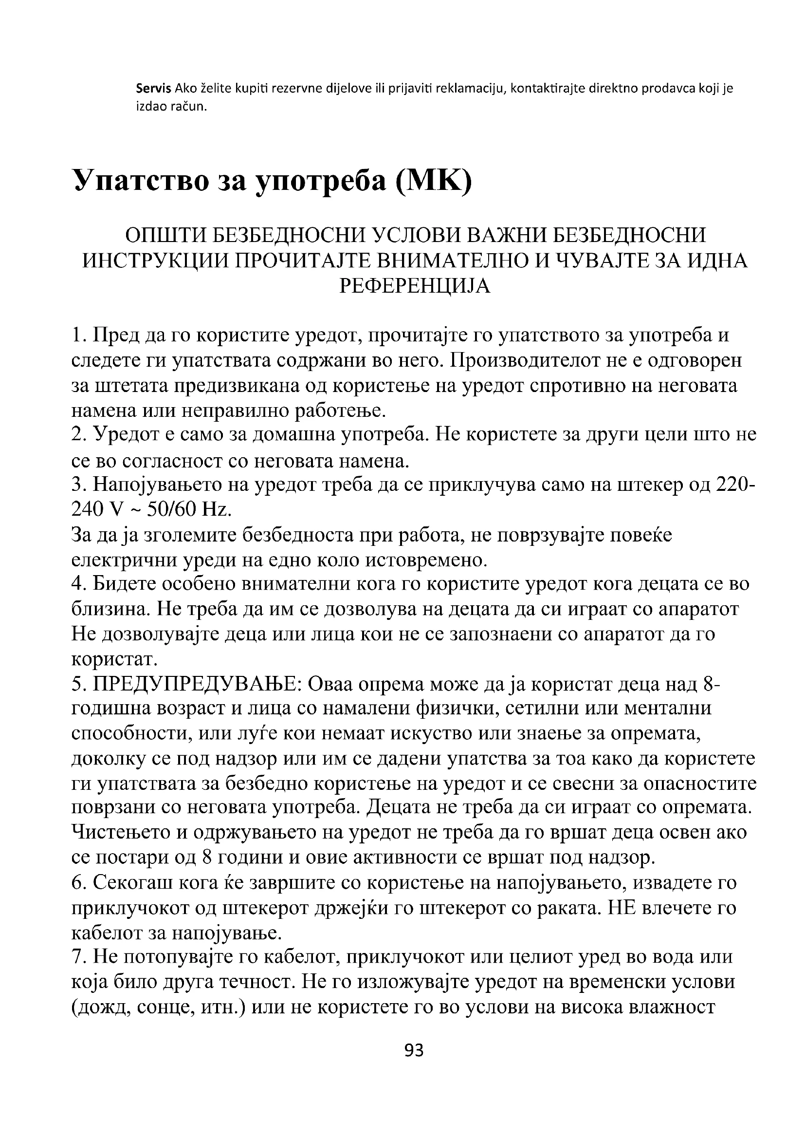 За доброто на животната средина. Картонската амбалажа и полиетиленските (PE) кеси треба да се фрлаат во соодветни контејнери наменети за селективно собирање на комуналниот отпад во согласност со нивниот опис. Ако има батерии во уредот, тие треба да се отстранат и да се однесат во место за собирање и складирање посебно. Употребениот уред треба да се врати во соодветно место за собирање и складирање, бидејќи опасните материи што ги содржи може да претставуваат закана за здравјето и животната средина. Ознаката на производот покажува дека уредот не треба да се фрла со комуналниот отпад. Отпадната електрична опрема е отпад кој содржи супстанции штетни за луѓето, животните и животната средина. Овие супстанции може да доведат до загадување на почвата, водата или воздухот, а со тоа може да навлезат во човечкото97 тело и да доведат до бројни здравствени заболувања, како што се: нарушувања на видот, слухот и говорот, а може да доведат и до оштетување на бубрезите, црниот дроб и срцето, и предизвикуваат кожни болести. Штетните материи, исто така, може да имаат негативен ефект врз респираторниот и репродуктивниот систем и да доведат до рак. Потрошувачката на растенија кои растат на обжалените почви и производи добиени од нив може да претставува ризик од горенаведените здравствени ефекти. Не фрлајте го уредот во контејнери за комунален отпад!! Сервис Ако сакате да купите резервни делови или да пријавите какви било поплаки, контактирајте директно со продавачот кој ја издал сметката. Korisnički priručnik (HR) OPĆI SIGURNOSNI UVJETI VAŽNE SIGURNOSNE UPUTE PAŽLJIVO PROČITAJTE I ČUVAJTE ZA BUDUĆU REFERENCU