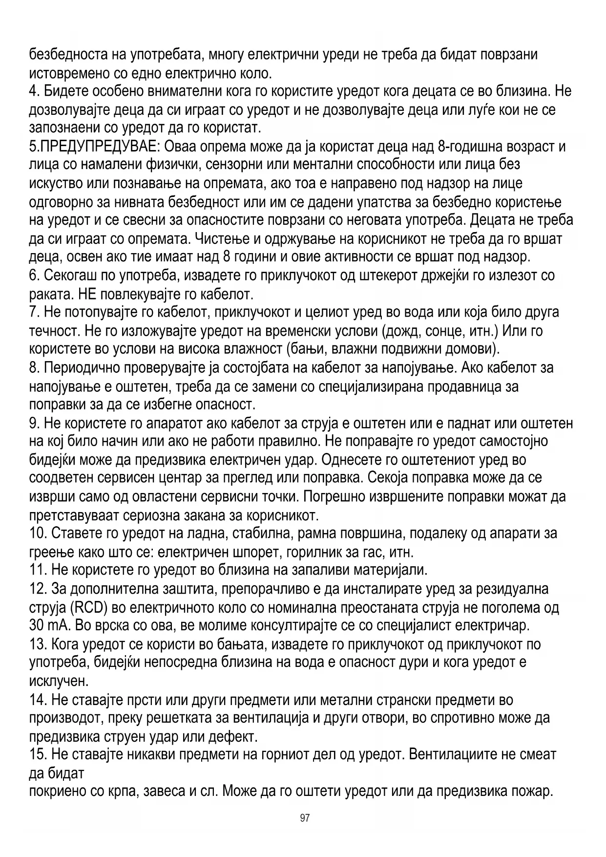 дозволувајте деца да си играат со уредот и не дозволувајте деца или луѓе кои не се запознаени со уредот да го користат. 5.ПРЕДУПРЕДУВАЕ: Оваа опрема може да ја користат деца над 8-годишна возраст и лица со намалени физички, сензорни или ментални способности или лица без искуство или познавање на опремата, ако тоа е направено под надзор на лице одговорно за нивната безбедност или им се дадени упатства за безбедно користење на уредот и се свесни за опасностите поврзани со неговата употреба. Децата не треба да си играат со опремата. Чистење и одржување на корисникот не треба да го вршат деца, освен ако тие имаат над 8 години и овие активности се вршат под надзор.