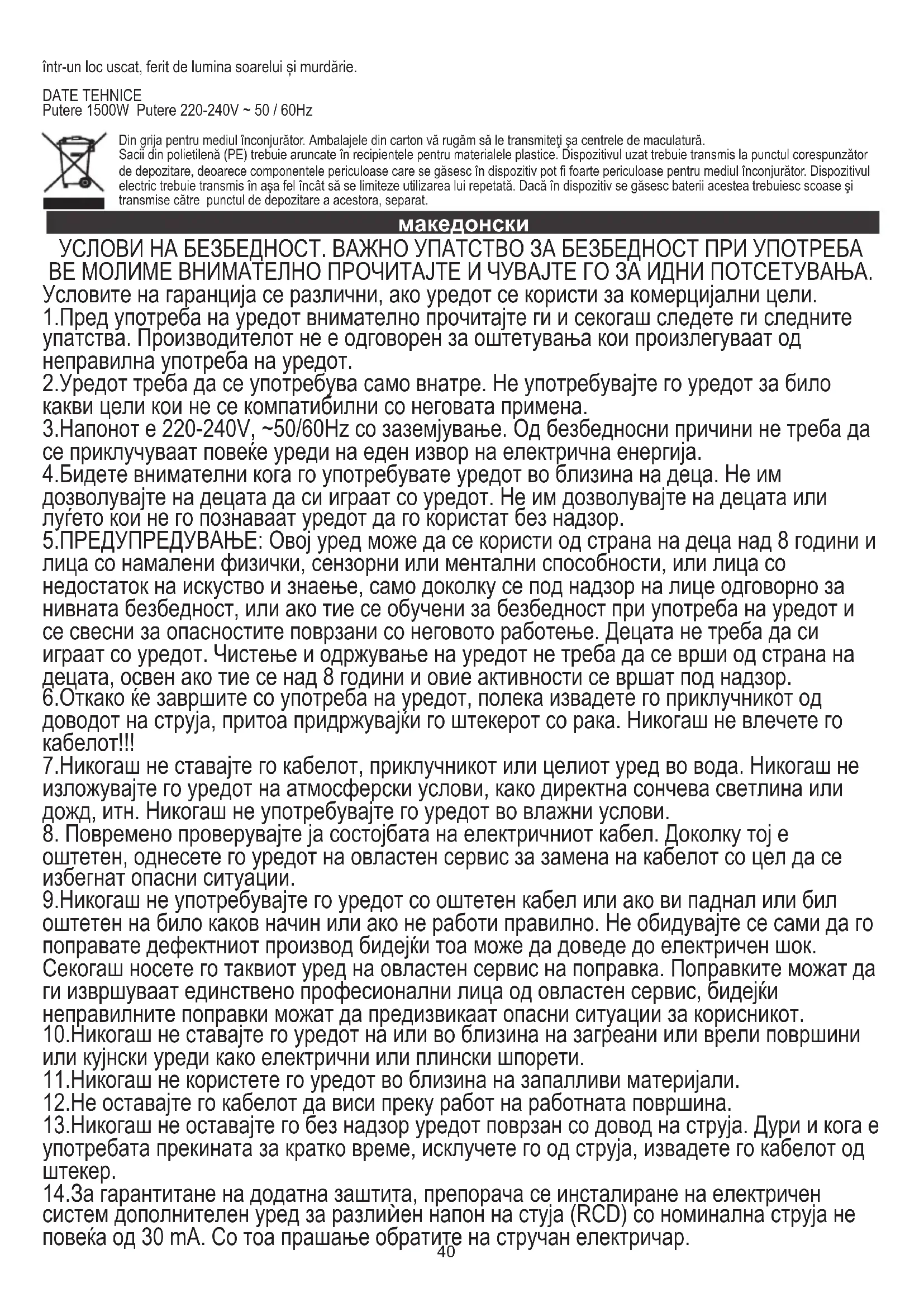 6.Ако апаратот не се користи подолг период, тој мора да биде заштитен од прекумерна прашина и нечистотија. Чувајте го грејачот на суво место, далеку од сончева светлина и нечистотија. ТЕХНИЧКИ ПОДАТОЦИ Моќност 1500W Моќност 220-240V ~ 50 / 60Hz За да се заштитат вашата околина: ве молиме одделни кутии и пластични кеси и да располага со нив во соодветните канти за отпадоци. Користи апаратот треба да биде предаден на посветен собирање поени поради hazarsous компоненти, кои можат да влијаат на животната средина. Не фрлајте овој апарат во заедничката корпа за отпадоци.