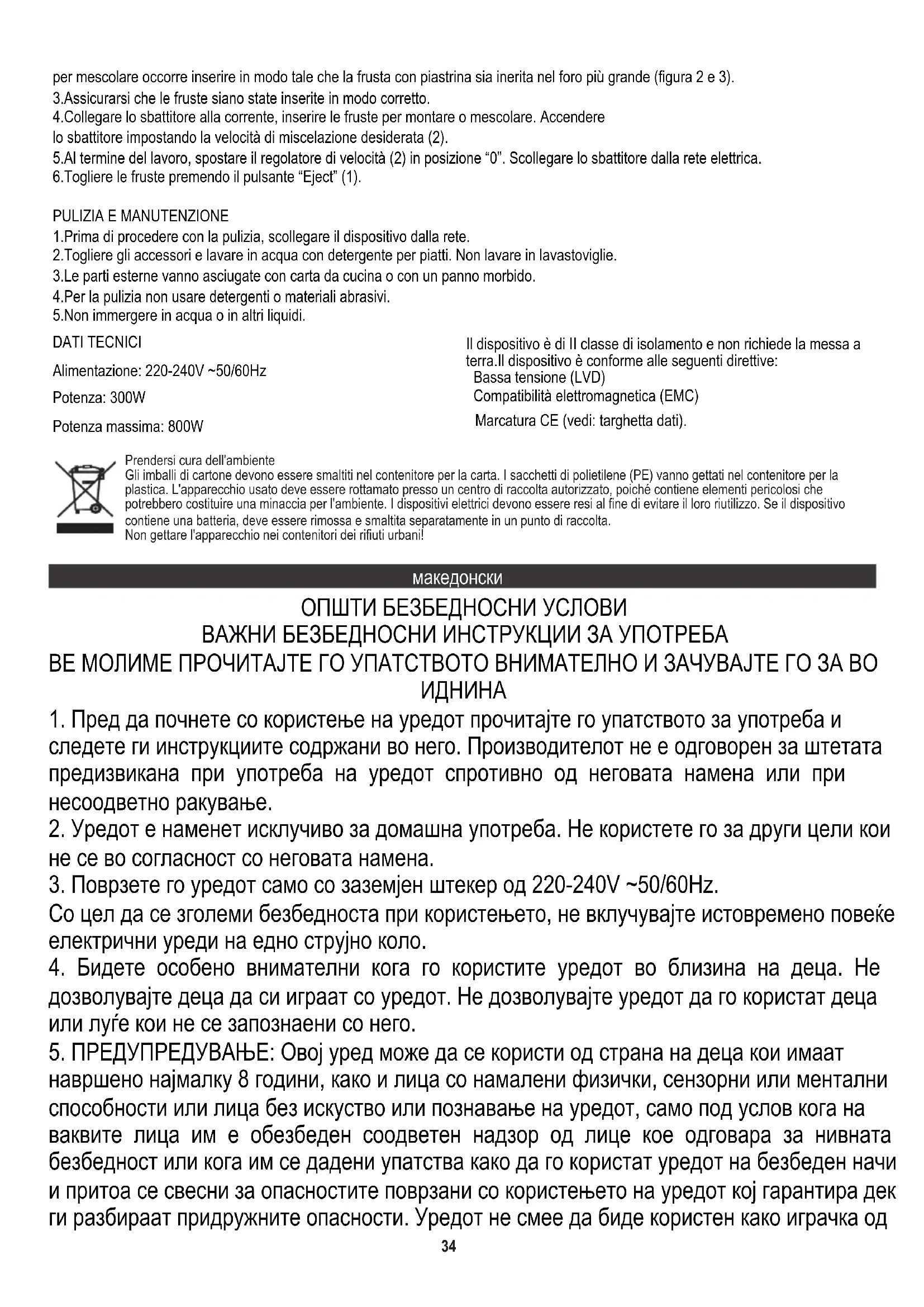 како што се: електричен шпорет, плински уреди и сл. 18.Кога мешате топли производи, внимавајте да не се изгорите. 21.Максималното континуирано работно време е 5 минути. По ова, почекајте додека уредот не се излади пред повторно да почнете да го користите.36 2.Ставете ги приклучните делови во отворите на дното на уредот. Приклучните делови за матење можат да се стават паралелно, додека деловите за мешање треба да се постават на таков начин што приклучниот дел со плочката се става во поголемиот од двата отвори на уредот (слики 2 и 3). УПОТРЕБА НА УРЕДОТ 1.Осигурајте се дека уредот е исклучен од електричната мрежа. 5.Приклучни делови за мешање 6.Тело на миксерот Максимална моќност: 800W 5.По завршувањето на работата, поставете го прекинувачот за контрола на брзината (2) во позиција "0" и исклучете го миксерот од напојувањето. 6.Извадете ги приклучните делови од миксерот со притискање на копчето “Eject” (1). 1.Пред чистење исклучете го уредот од напојување. 5.Не потопувајте го уредот во вода или во други течности. 3.Избришете ги надворешните делови со кујнски крпи или мека крпичка. 4.Приклучете го миксерот во напојување, ставете ги приклучните делови за матење или за мешање во состојките. Стартувајте го миксерот со вклучување на прекинувачот за контрола на брзината (2) до соодветната брзина на мешање. Моќност: 300W 2.Отстранете ги приклучните делови пред да ги измиете во вода со средство за миење садови. Не мијте ги во машина за миење