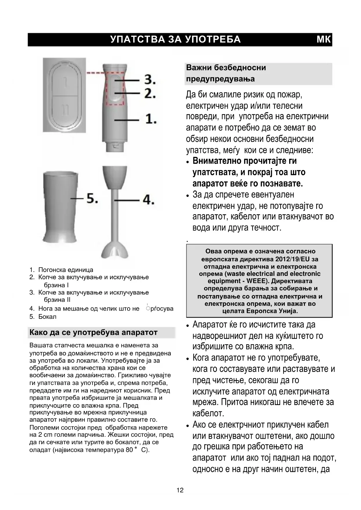 Како да се употребува апаратот Вашата стапчеста мешалка е наменета за употреба во домаќинството и не е предвидена за употреба во локали. Употребувајте ја за обработка на количества храна кои се вообичаени за домаќинство. Грижливо чувајте ги упатствата за употреба и, спрема потреба, предадете им ги на наредниот корисник. Пред првата употреба избришите ја мешалката и приклучоците со влажна крпа. Пред приклучување во мрежна приклучница апаратот најпрвин правилно составите го. Поголеми состојки пред обработка нарежете на 2 cm големи парчиња. Жешки состојки, пред да ги сечкате или турите во бокалот, да се оладат (највисока температура 80 °C). Важни безбедносни предупредувања Да би смалиле ризик од пожар, електричен удар и/или телесни повреди, при употреба на електрични апарати е потребно да се земат во обѕир некои основни безбедносни упатства, меѓу кои се и следниве:
