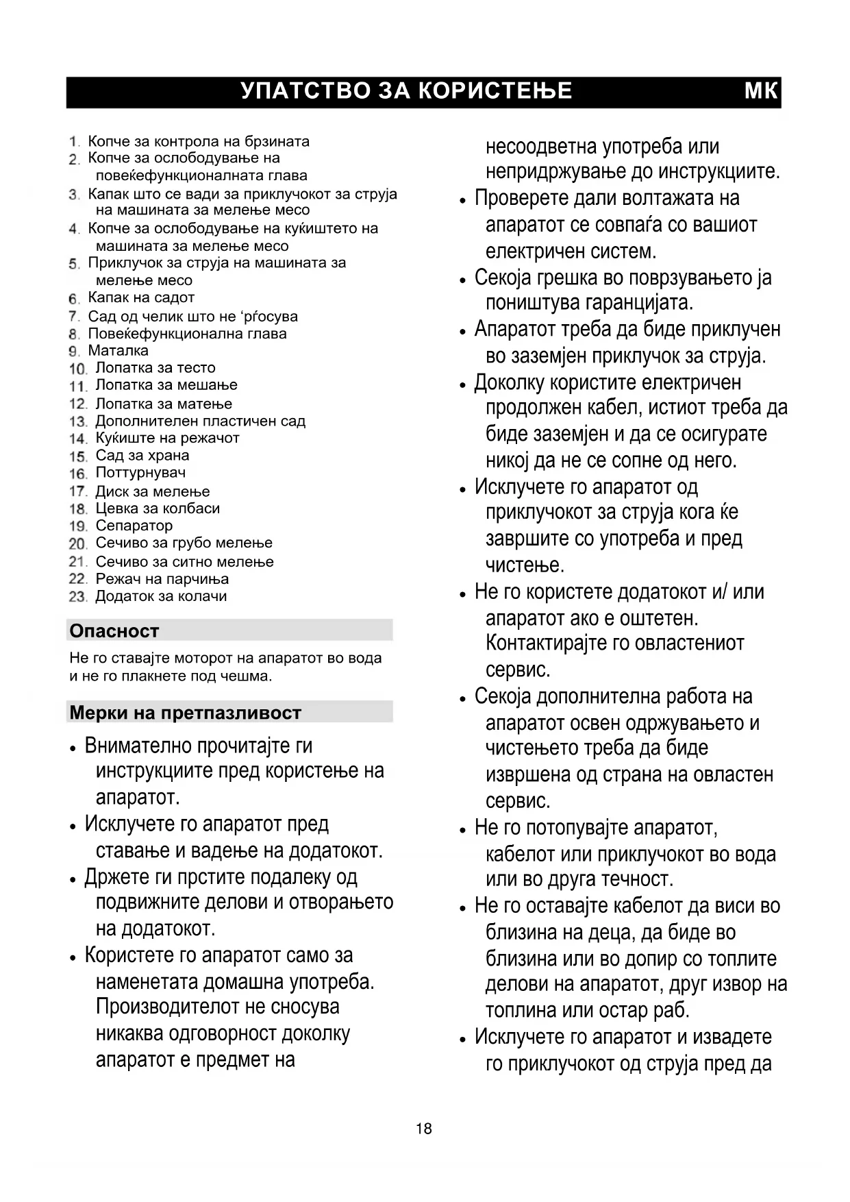 APARATOM! Pridržavamo pravo na izmene!18 УПАТСТВО ЗА КОРИСТЕЊЕ МК Копче за контрола на брзината Копче за ослободување на повеќефункционалната глава Капак што се вади за приклучокот за струја на машината за мелење месо Копче за ослободување на куќиштето на машината за мелење месо Приклучок за струја на машината за мелење месо Капак на садот Сад од челик што не ‘рѓосува Повеќефункционална глава
