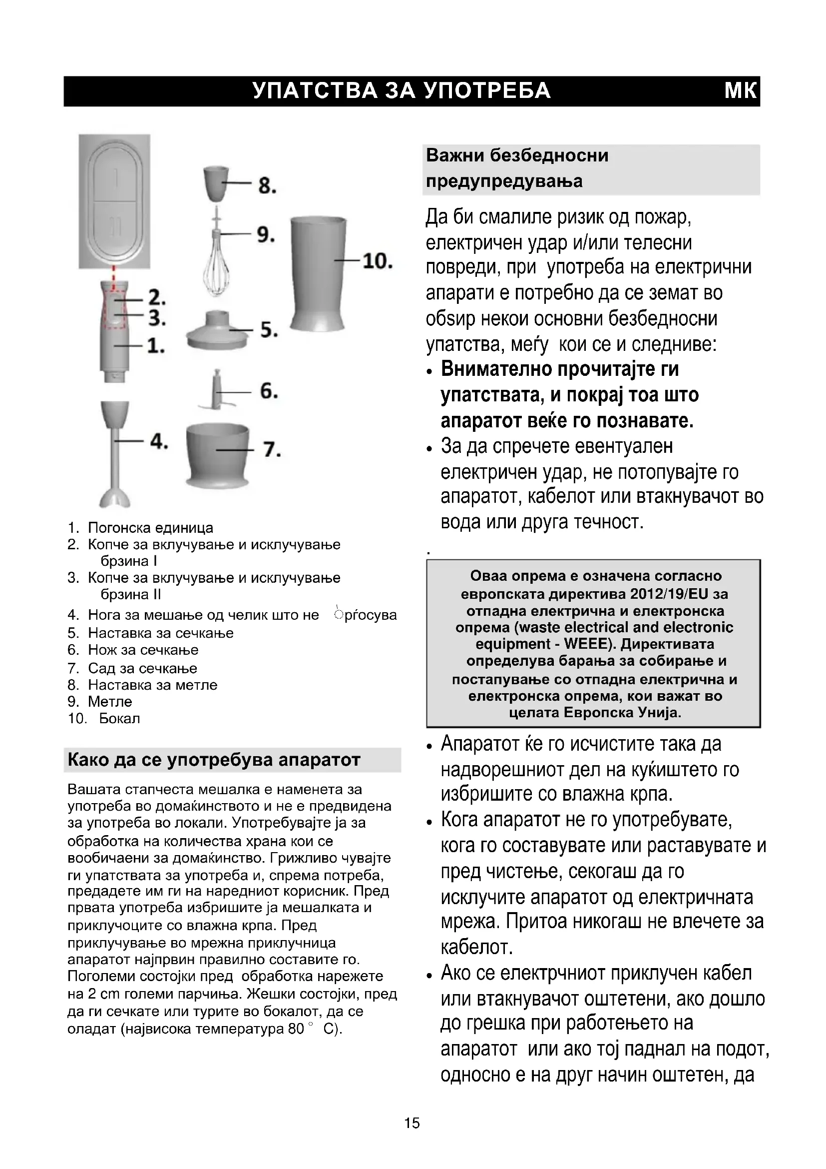 Како да се употребува апаратот Вашата стапчеста мешалка е наменета за употреба во домаќинството и не е предвидена за употреба во локали. Употребувајте ја за обработка на количества храна кои се вообичаени за домаќинство. Грижливо чувајте ги упатствата за употреба и, спрема потреба, предадете им ги на наредниот корисник. Пред првата употреба избришите ја мешалката и приклучоците со влажна крпа. Пред приклучување во мрежна приклучница апаратот најпрвин правилно составите го. Поголеми состојки пред обработка нарежете на 2 cm големи парчиња. Жешки состојки, пред да ги сечкате или турите во бокалот, да се оладат (највисока температура 80 °C). Важни безбедносни предупредувања Да би смалиле ризик од пожар, електричен удар и/или телесни повреди, при употреба на електрични апарати е потребно да се земат во обѕир некои основни безбедносни упатства, меѓу кои се и следниве: