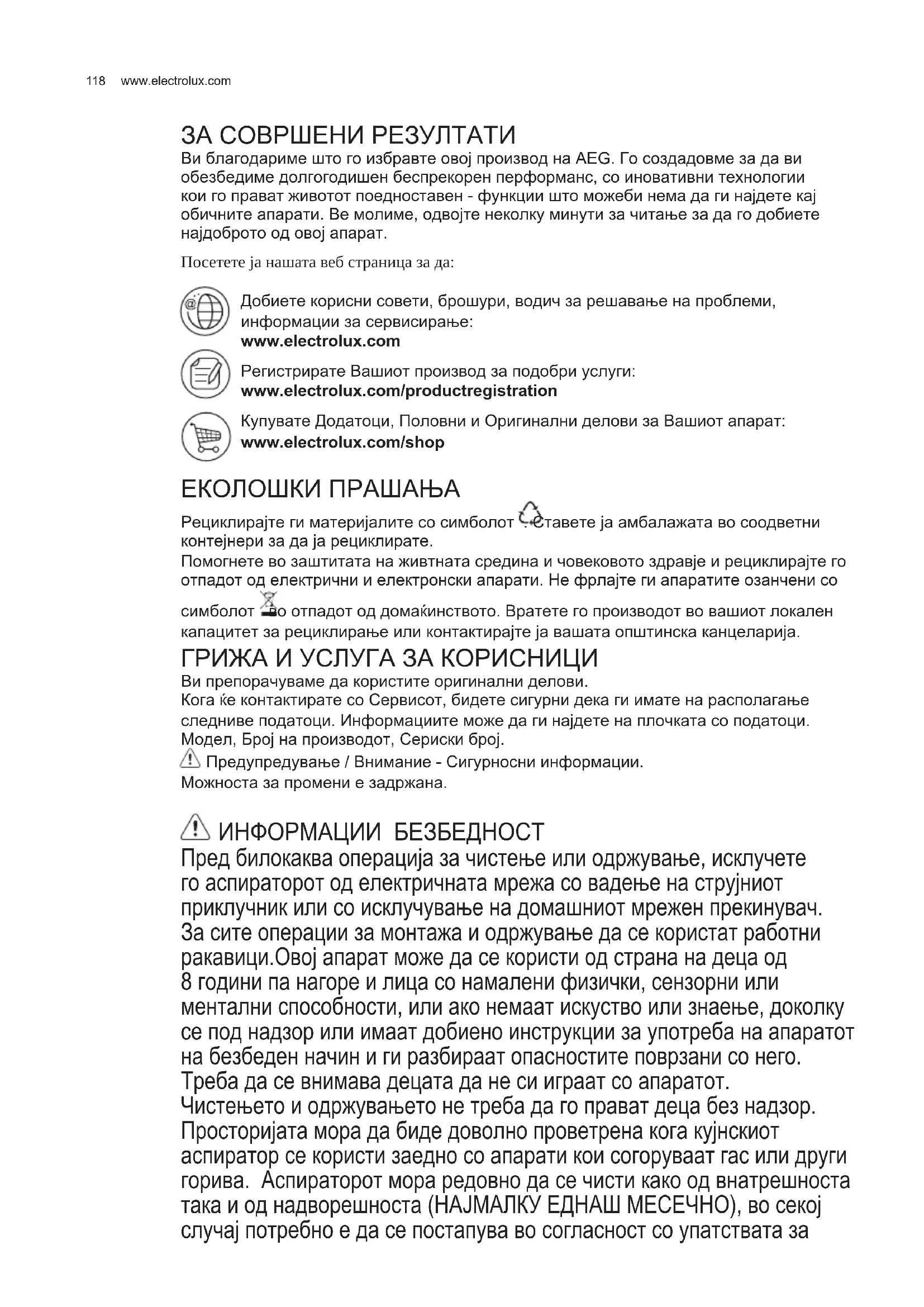 ЗА СОВРШЕНИ РЕЗУЛТАТИ Ви благодариме што го избравте овој производ на AEG. Го создадовме за да ви обезбедиме долгогодишен беспрекорен перформанс, со иновативни технологии кои го прават животот поедноставен - функции што можеби нема да ги најдете кај обичните апарати. Ве молиме, одвојте неколку минути за читање за да го добиете најдоброто од овој апарат. Посетете ја нашата веб страница за да: Добиете корисни совети, брошури, водич за решавање на проблеми, информации за сервисирање: www.electrolux.com Регистрирате Вашиот производ за подобри услуги: www.electrolux.com/productregistration Купувате Додатоци, Половни и Оригинални делови за Вашиот апарат: www.electrolux.com/shop ЕКОЛОШКИ ПРАШАЊА Рециклирајте ги материјалите со симболот . Ставете ја амбалажата во соодветни контејнери за да ја рециклирате. Помогнете во заштитата на живтната средина и човековото здравје и рециклирајте го отпадот од електрични и електронски апарати. Не фрлајте ги апаратите озанчени со симболот во отпадот од домаќинството. Вратете го производот во вашиот локален капацитет за рециклирање или контактирајте ја вашата општинска канцеларија. ГРИЖА И УСЛУГА ЗА КОРИСНИЦИ Ви препорачуваме да користите оригинални делови. Кога ќе контактирате со Сервисот, бидете сигурни дека ги имате на располагање следниве податоци. Информациите може да ги најдете на плочката со податоци. Модел, Број на производот, Сериски број. Предупредување / Внимание - Сигурносни информации. Можноста за промени е задржана. ИНФОРМАЦИИ БЕЗБЕДНОСТ Пред билокаква операција за чистење или одржување, исклучете го аспираторот од електричната мрежа со вадење на струјниот приклучник или со исклучување на домашниот мрежен прекинувач. За сите операции за монтажа и одржување да се користат работни ракавици.Овој апарат може да се користи од страна на деца од 8 години па нагоре и лица со намалени физички, сензорни или ментални способности, или ако немаат искуство или знаење, доколку се под надзор или имаат добиено инструкции за употреба на апаратот на безбеден начин и ги разбираат опасностите поврзани со него. Треба да се внимава децата да не си играат со апаратот. Чистењето и одржувањето не треба да го прават деца без надзор. Просторијата мора да биде доволно проветрена кога кујнскиот аспиратор се користи заедно со апарати кои согоруваат гас или други горива. Аспираторот мора редовно да се чисти како од внатрешноста така и од надворешноста (НАЈМАЛКУ ЕДНАШ МЕСЕЧНО), во секој случај потребно е да се постапува во согласност со упатствата за MK УПАТСТВО ЗА КОРИСНИК119