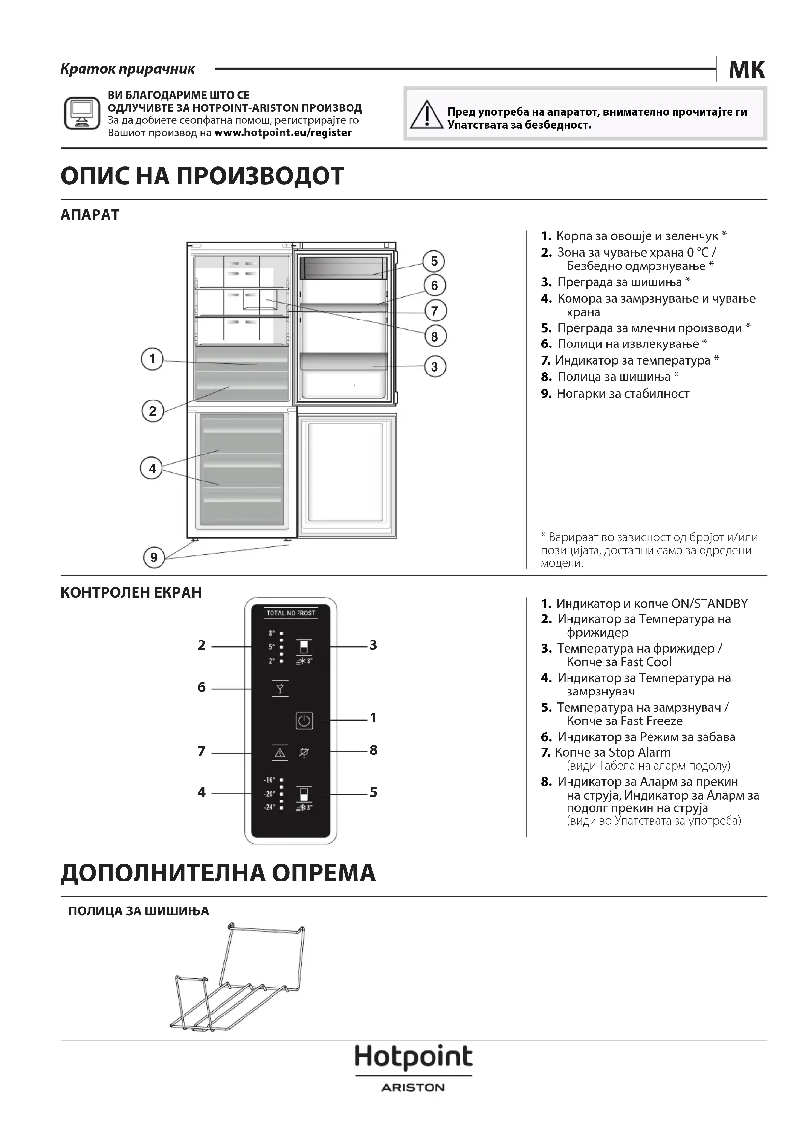 ВИ БЛАГОДАРИМЕ ШТО СЕ ОДЛУЧИВТЕ ЗА HOTPOINT-ARISTON ПРОИЗВОДЗа да добиете сеопфатна помош, регистрирајте го Вашиот производ на www . hotpoint . eu/ register Пред употреба на апаратот, внимателно прочитајте ги Упатствата за безбедност. ДОПОЛНИТЕЛНА ОПРЕМА ПОЛИЦА ЗА ШИШИЊАПРВА УПОТРЕБА КАКО ДА ГО АКТИВИРАТЕ АПАРАТОТ По приклучување на апаратот во струја, тој почнува автоматски да работи. По стартување на апаратот, почекајте најмалку 4-6 часа пред да ставите храна во фрижидерот и во комората за замрзнување. Кога апаратот е поврзан во струја, екранот се вклучува и сите икони се појавуваат на екранот за околу 1 секунда. Се вклучуваат функциите на стандардните (фабрички) вредности на фрижидерот - комората за замрзнување. СЕКОЈДНЕВНА УПОТРЕБА