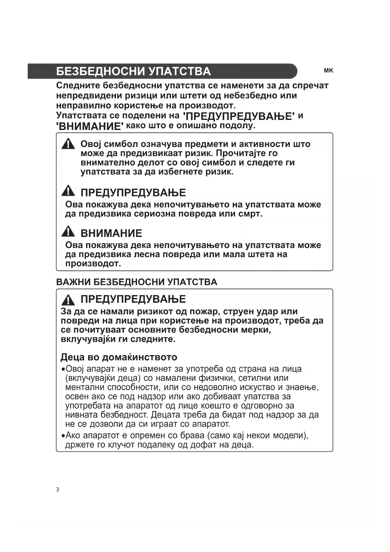 - Ако апаратот е опремен со брава (само кај некои модели), држете го клучот подалеку од дофат на деца. Овој симбол означува предмети и активности што може да предизвикаат ризик. Прочитајте го внимателно делот со овој симбол и следете ги упатствата за да избегнете ризик. ПРЕДУПРЕДУВАЊЕ Ова покажува дека непочитувањето на упатствата може да предизвика сериозна повреда или смрт. Ова покажува дека непочитувањето на упатствата може да предизвика лесна повреда или мала штета на производот. 3MK За употреба во Европа: Овој апарат може да го користат деца постари од 8 години и лица со намалени физички, сетилни или ментални способности или со недоволно искуство и знаење, ако се под надзор или добиваат упатства за употреба на апаратот на безбеден начин и ги разбираат опасностите што можат да произлезат. Деца не смеат да си играат со апаратот. Чистењето и одржувањето не смеат да го прават деца без надзор.