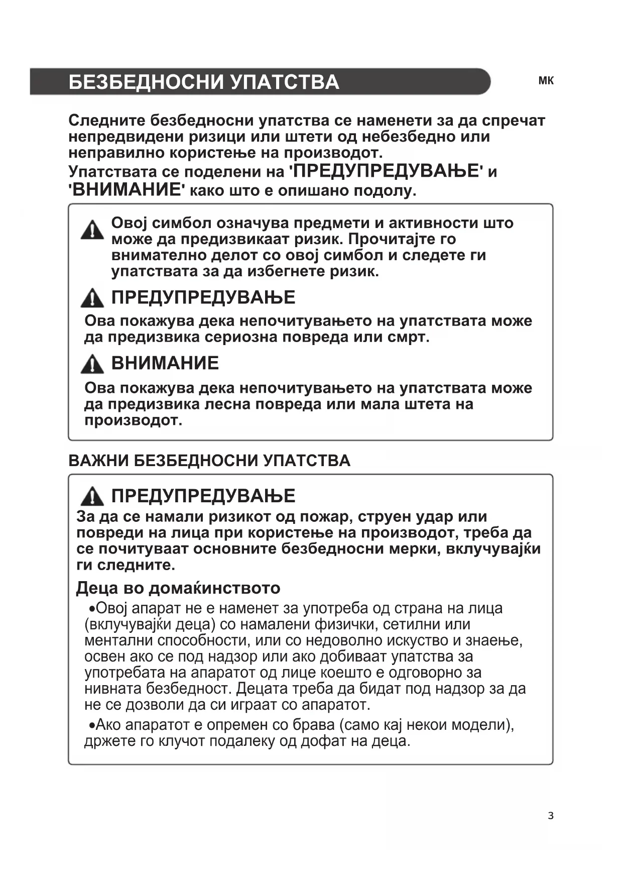 Следните безбедносни упатства се наменети за да спречат непредвидени ризици или штети од небезбедно или неправилно користење на производот. Упатствата се поделени на 'ПРЕДУПРЕДУВАЊЕ' и 'ВНИМАНИЕ' како што е опишано подолу. Овој симбол означува предмети и активности што може да предизвикаат ризик. Прочитајте го внимателно делот со овој симбол и следете ги упатствата за да избегнете ризик. ПРЕДУПРЕДУВАЊЕ Ова покажува дека непочитувањето на упатствата може да предизвика сериозна повреда или смрт. Ова покажува дека непочитувањето на упатствата може да предизвика лесна повреда или мала штета на производот. ВАЖНИ БЕЗБЕДНОСНИ УПАТСТВА ПРЕДУПРЕДУВАЊЕ За да се намали ризикот од пожар, струен удар или повреди на лица при користење на производот, треба да се почитуваат основните безбедносни мерки, вклучувајќи ги следните. Деца во домаќинството