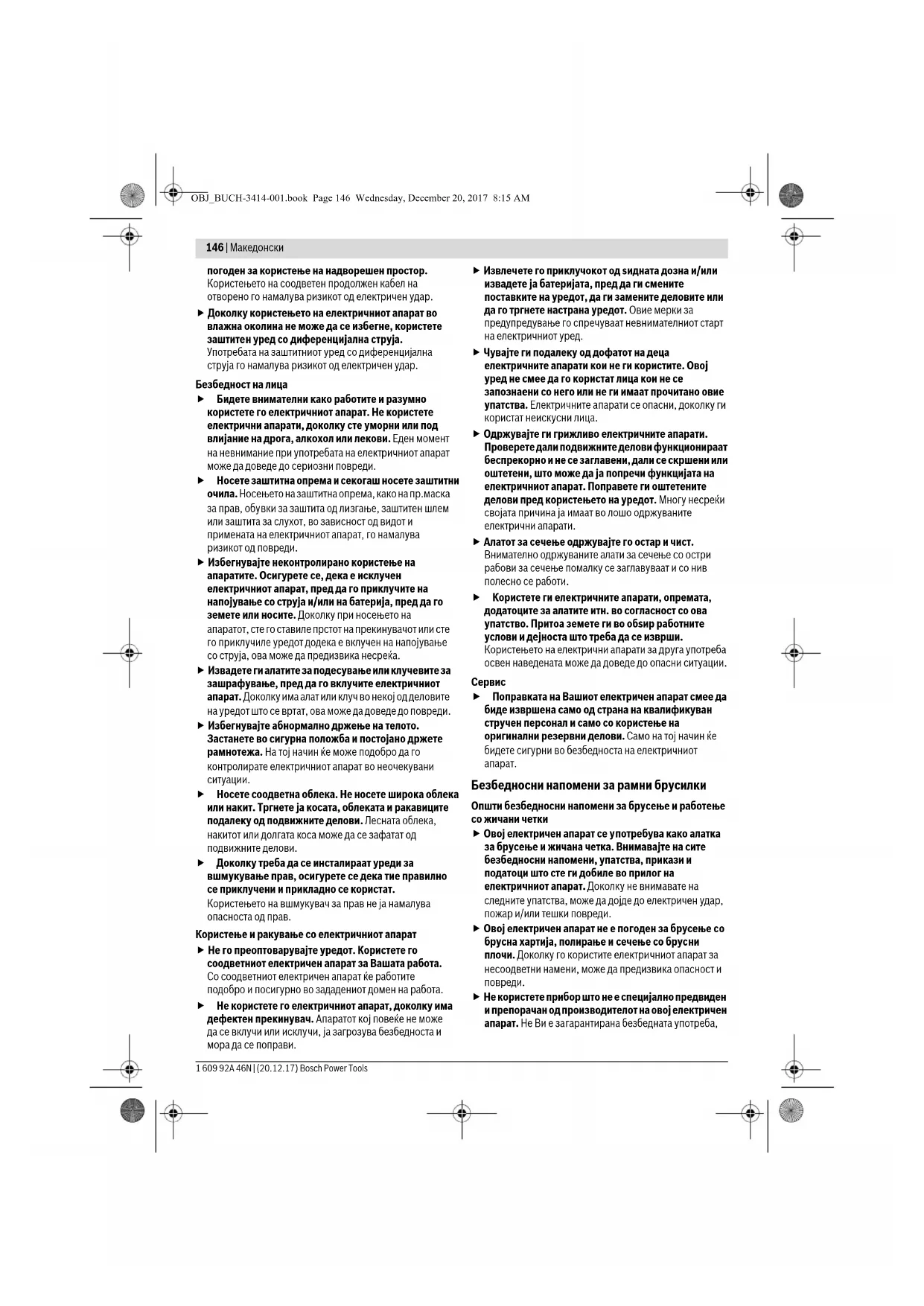 Безбедносни напомени Општи напомени за безбедност за електричните апарати Прочитајте ги сите напомени и упатства за безбедност. Грешките настанати како резултат од непридржување до безбедносните напомени и упатства може да предизвикаат електричен удар, пожар и/или тешки повреди. Зачувајте ги безбедносните напомени и упатства за користење и за во иднина. Поимот „електричен алат“ во напомените за безбедност се однесува на електрични апарати што користат струја (со струен кабел) и електрични апарати што користат батерии (без струен кабел). Безбедност на работното место Работниот простор секогаш нека биде чист и добро осветлен. Неуредниот или неосветлен работен простор може да доведе до несреќи. Не работете со електричниот апарат во околина каде постои опасност од експлозија, каде има запаливи течности, гас или прашина. Електричните апарати создаваат искри, кои може да ја запалат правта или пареата. Држете ги децата и другите лица подалеку за време на користењето на електричниот апарат. Доколку нешто Ви го попречи вниманието, може да ја изгубите контролата над уредот. Електрична безбедност Приклучокот на електричниот апарат мора да одговара на приклучокот во ѕидната дозна. Приклучокот во никој случај не смее да се менува. Не употребувајте прекинувач со адаптер заедно со заземјениот електричен апарат. Неменувањето на прекинувачот и соодветните ѕидни дозни го намалуваат ризикот од електричен удар. Избегнувајте физички контакт со заземјените површини на цевки, радијатори, шпорет и фрижидери. Постои зголемен ризик од електричен удар, доколку Вашето тело е заземјено. Електричните апарати држете ги подалеку од дожд и влага. Навлегувањето на вода во електричниот апарат го зголемува ризикот од електричен удар. Не го користите кабелот за друга намена, за да го носите електричниот апарат, за да го закачите или да го влечете приклучокот од ѕидната дозна. Држете го кабелот понастрана од топлина, масло, остри рабови или подвижните компоненти на уредот. Оштетениот или свиткан кабел го зголемува ризикот за електричен удар. Доколку со електричниот апарат работите на отворено, користете само продолжен кабел што е ПРЕДУПРЕДУВАЊЕ OBJ_BUCH-3414-001.book Page 145 Wednesday, December 20, 2017 8:15 AM146 | Македонски 1 609 92A 46N | (20.12.17) Bosch Power Tools погоден за користење на надворешен простор. Користењето на соодветен продолжен кабел на отворено го намалува ризикот од електричен удар. Доколку користењето на електричниот апарат во влажна околина не може да се избегне, користете заштитен уред со диференцијална струја. Употребата на заштитниот уред со диференцијална струја го намалува ризикот од електричен удар. Безбедност на лица Бидете внимателни како работите и разумно користете го електричниот апарат. Не користете електрични апарати, доколку сте уморни или под влијание на дрога, алкохол или лекови. Еден момент на невнимание при употребата на електричниот апарат може да доведе до сериозни повреди. Носете заштитна опрема и секогаш носете заштитни очила. Носењето на заштитна опрема, како на пр.маска за прав, обувки за заштита од лизгање, заштитен шлем или заштита за слухот, во зависност од видот и примената на електричниот апарат, го намалува ризикот од повреди. Избегнувајте неконтролирано користење на апаратите. Осигурете се, дека е исклучен електричниот апарат, пред да го пр