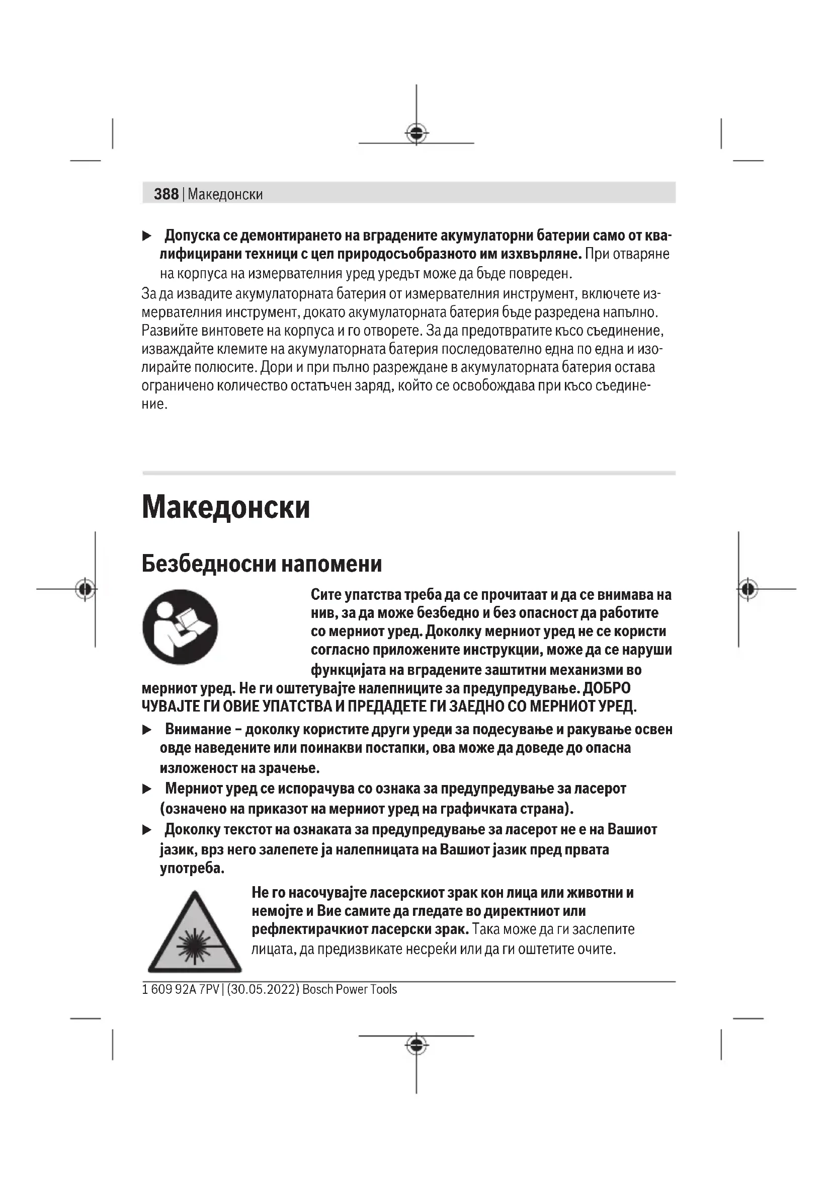 Не го насочувајте ласерскиот зрак кон лица или животни и немојте и Вие самите да гледате во директниот или рефлектирачкиот ласерски зрак. Така може да ги заслепите лицата, да предизвикате несреќи или да ги оштетите очите. 1 609 92A 7PV | (30.05.2022) Bosch Power ToolsМакедонски | 389 u Доколку ласерскиот зрак доспее до очите, веднаш треба да ги затворите и да ја тргнете главата од ласерскиот зрак. u Не правете промени на ласерскиот уред. u Не ги користете ласерските заштитни очила (дополнителна опрема) како заштитни очила. Ласерските заштитни очила служат за подобро распознавање на ласерскиот зрак; сепак, тие не штитат од ласерското зрачење. u Не ги користете ласерските заштитни очила (дополнителна опрема) како очила за сонце или пак во сообраќајот. Ласерските очила не даваат целосна UV- заштита и го намалуваат препознавањето на бои. u Мерниот уред смее да се поправа само од страна на квалификуван стручен персонал и само со оригинални резервни делови. Само на тој начин ќе бидете сигурни во безбедноста на мерниот уред. u Не ги оставајте децата да го користат ласерскиот мерен уред без надзор. Без надзор, тие може да се заслепат себеси или други лица. u Не работете со мерниот уред во околина каде постои опасност од експлозија, каде има запаливи течности, гас или прашина. Мерниот уред создава искри, кои може да ја запалат правта или пареата. u При погрешно користење или при оштетена батерија може да истече запалива течност од батеријата. Избегнувајте контакт со неа. Доколку случајно дојдете во контакт со течноста, исплакнете со вода. Доколку течноста дојде во контакт со очите, побарајте лекарска помош. Истечената течност од батеријата може да предизвика кожни иритации или изгореници. u Батериите полнете ги со полначи што се препорачани исклучиво од производителот. Доколку полначот за кој се наменети одреден вид на батерии, се користи со други батерии, постои опасност од пожар. Заштитете го мерниот уред од топлина, на пр. исто така од постојана изложеност на сончеви зраци, оган, вода или влажност. Постои опасност од експлозија. u Мерниот уред е опремен со безжичен интерфејс. Треба да се внимава на локалните оперативни ограничувања, на пр. во авиони или болници. Ознаката со зборови Bluetooth® како и сликите (логоата) се регистрирани марки и сопственост на Bluetooth SIG, Inc. Секое користење на оваа ознака со зборови/ слики се врши со лиценца преку Robert Bosch Power Tools GmbH. u Внимание! При користењето на мерниот уред со Bluetooth® може да настанат пречки на другите уреди и системи, авиони и медицински апарати (на пр. пејсмејкер, апаратчиња за слушање). Исто така не може целосно да се исклучи можноста за повреда на луѓе и животни во непосредна околина. Не Bosch Power Tools 1 609 92A 7PV | (30.05.2022)390 | Македонски го користете мерниот уред со Bluetooth® во близина на медицински уреди, бензински пумпи, хемиски уреди, области со опасност од експлозија и во близина на мински полиња. Не го користете мерниот уред со Bluetooth® во авиони. Избегнувајте долготрајна употреба во директна близина на телото. u Не го користете мерниот уред со вметнат USB-кабел. u Не го користете мерниот уред како надворешна USB-меморија. u Не фотографирајте луѓе или животни со мерниот уред, бидејќи притоа може ласерскиот зрак да остане постојано вклучен. При вклучен ласерски зрак можете да ги заслепите лицата, да предизвикате несреќи или да ги оштетите очите. u Не го