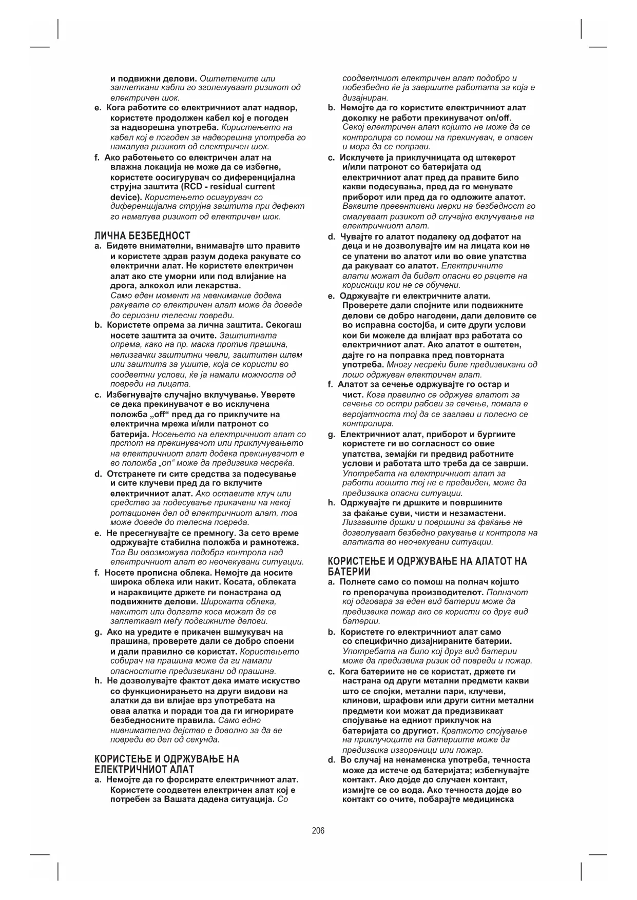 205и подвижни делови. Оштетените или заплеткани кабли го зголемуваат ризикот од електричен шок. e. Кога работите со електричниот алат надвор, користете продолжен кабел кој е погоден за надворешна употреба. Користењето на кабел кој е погоден за надворешна употреба го намалува ризикот од електричен шок. f. Ако работењето со електричен алат на влажна локација не може да се избегне, користете oосигурувач со диференцијална струјна заштита (RCD - residual current device). Користењето осигурувач со диференцијална струјна заштита при дефект го намалува ризикот од електричен шок. ЛИЧНА БЕЗБЕДНОСТ a. Бидете внимателни, внимавајте што правите и користете здрав разум додека ракувате со електрични алат. Не користете електричен алат ако сте уморни или под влијание на дрога, алкохол или лекарства. Само еден момент на невнимание додека ракувате со електричен алат може да доведе до сериозни телесни повреди. b. Користете опрема за лична заштита. Секогаш носете заштита за очите. Заштитната опрема, како на пр. маска против прашина, нелизгачки заштитни чевли, заштитен шлем или заштита за ушите, која се користи во соодветни услови, ќе ја намали можноста од повреди на лицата. c. Избегнувајте случајно вклучување. Уверете се дека прекинувачот е во исклучена положба „o“ пред да го приклучите на електрична мрежа и/или патронот со батерија. Носењето на електричниот алат со прстот на прекинувачот или приклучувањето на електричниот алат додека прекинувачот е во положба „on“ може да предизвика несреќа. d. Отстранете ги сите средства за подесување и сите клучеви пред да го вклучите електричниот алат. Ако оставите клуч или средство за подесување прикачени на некој ротационен дел од електричниот алат, тоа може доведе до телесна повреда. e. Не пресегнувајте се премногу. За сето време одржувајте стабилна положба и рамнотежа. Тоа Ви овозможува подобра контрола над електричниот алат во неочекувани ситуации. f. Носете прописна облека. Немојте да носите широка облека или накит. Косата, облеката и нараквиците држете ги понастрана од подвижните делови. Широката облека, накитот или долгата коса можат да се заплеткаат меѓу подвижните делови. g. Ако на уредите е прикачен вшмукувач на прашина, проверете дали се добро споени и дали правилно се користат. Користењето собирач на прашина може да ги намали опасностите предизвикани од прашина. h. Не дозволувајте фактот дека имате искуство со функционирањето на други видови на алатки да ви влијае врз употребата на оваа алатка и поради тоа да ги игнорирате безбедносните правила. Само едно нивнимателно дејство е доволно за да ве повреди во дел од секунда. КОРИСТЕЊЕ И ОДРЖУВАЊЕ НА ЕЛЕКТРИЧНИОТ АЛАТ a. Немојте да го форсирате електричниот алат. Користете соодветен електричен алат кој е потребен за Вашата дадена ситуација. Со соодветниот електричен алат подобро и побезбедно ќе ја завршите работата за која е дизајниран. b. Немојте да го користите електричниот алат доколку не работи прекинувачот on/o. Секој електричен алат којшто не може да се контролира со помош на прекинувач, е опасен и мора да се поправи. c. Исклучете ја приклучницата од штекерот и/или патронот со батеријата од електричниот алат пред да правите било какви подесувања, пред да го менувате приборот или пред да го одложите алатот. Ваквите превентивни мерки на безбедност го смалуваат ризико
