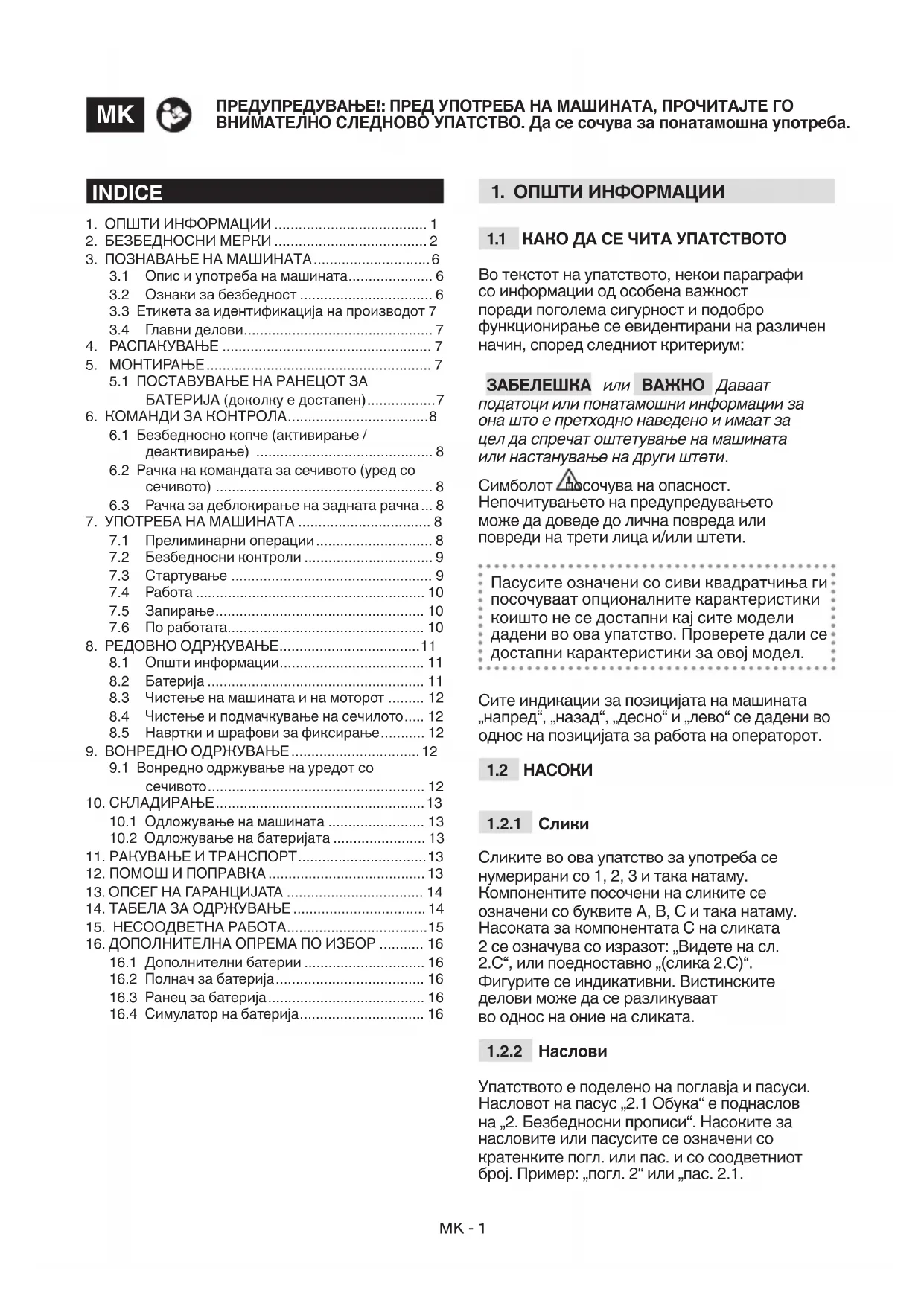 Ова упатство ги претставува сите неопходни индикации за управување со машината и за правилно одржување што ги извршува корисникот. Сите интервенции и одржувања на косилката што не се дадени во ова упатство треба да се извршат од страна на Дилерот или Овластениот сервисен центар, бидејќи имаат големо познавање и ракуваат со потребната опрема за правилно извршување на работата, земајќи го предвид соодветниот степен на безбедност и состојбата на косилката. Сите операции што се изведени на несоодветен начин и од неквалификувани лица придонесуваат да се прекине важноста на гаранција и обврските на Производителот.MK - 14