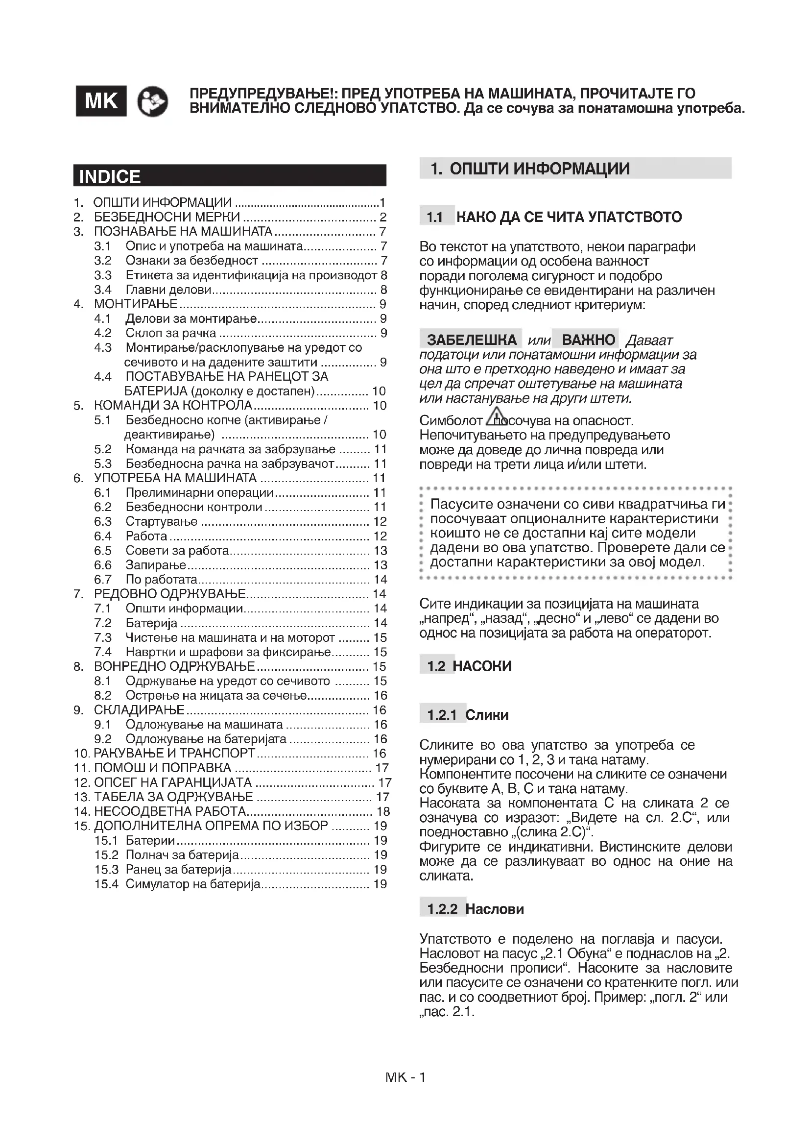 Ова упатство ги претставува сите неопходни индикации за управување со машината и за правилно одржување што ги извршува корисникот. Сите интервенции и одржувања на косилката што не се дадени во ова упатство треба да се извршат од страна на Дилерот или Овластениот сервисен центар, бидејќи имаат големо познавање и ракуваат со потребната опрема за правилно извршување на работата, земајќи го предвид соодветниот степен на безбедност и состојбата на