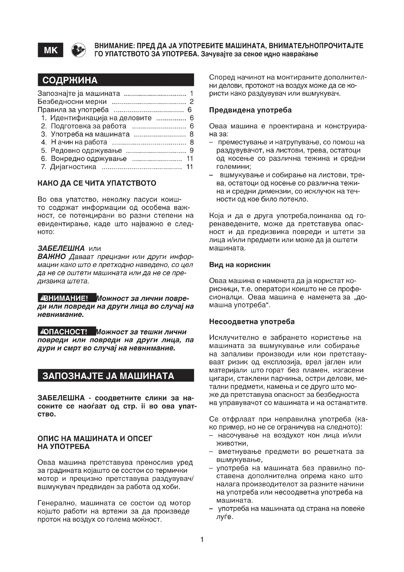ОПИС НА МАШИНАТА И ОПСЕГ НА УПОТРЕБА Оваа машина претставува пренослив уред за градината којашто се состои со термички мотор и прецизно претставува раздувувач/ вшмукувач предвиден за работа од хоби. Генерално, машината се состои од мотор којшто работи на вртежи за да произведе проток на воздух со голема моќност. Според начинот на монтираните дополнител- ни делови, протокот на воздух може да се ко- ристи како раздувувач или вшмукувач. Предвидена употреба Оваа машина е проектирана и конструира-