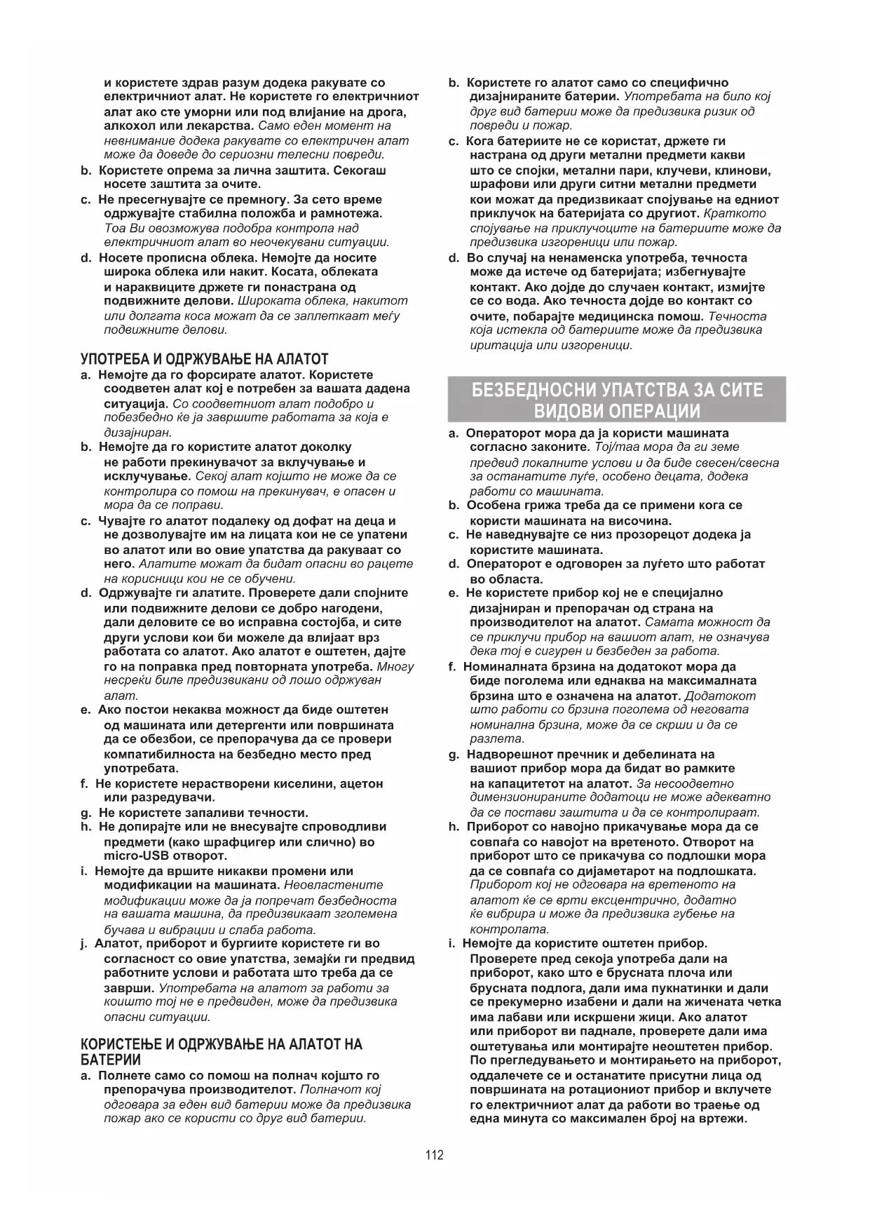 a. Полнете само со помош на полнач којшто го препорачува производителот. Полначот кој одговара за еден вид батерии може да предизвика пожар ако се користи со друг вид батерии. b. Користете го алатот само со специфично дизајнираните батерии. Употребата на било кој друг вид батерии може да предизвика ризик од повреди и пожар. c. Кога батериите не се користат, држете ги настрана од други метални предмети какви што се спојки, метални пари, клучеви, клинови, шрафови или други ситни метални предмети кои можат да предизвикаат спојување на едниот приклучок на батеријата со другиот. Краткото спојување на приклучоците на батериите може да предизвика изгореници или пожар. d. Во случај на ненаменска употреба, течноста може да истече од батеријата; избегнувајте контакт. Ако дојде до случаен контакт, измијте се со вода. Ако течноста дојде во контакт со очите, побарајте медицинска помош. Течноста која истекла од батериите може да предизвика иритација или изгореници. БЕЗБЕДНОСНИ УПАТСТВА ЗА СИТЕ ВИДОВИ ОПЕРАЦИИ a. Операторот мора да ја користи машината согласно законите. Тој/таа мора да ги земе предвид локалните услови и да биде свесен/свесна за останатите луѓе, особено децата, додека работи со машината. b. Особена грижа треба да се примени кога се користи машината на височина. c. Не наведнувајте се низ прозорецот додека ја користите машината. d. Операторот е одговорен за луѓето што работат во областа. e. Не користете прибор кој не е специјално дизајниран и препорачан од страна на производителот на алатот. Самата можност да се приклучи прибор на вашиот алат, не означува дека тој е сигурен и безбеден за работа. f. Номиналната брзина на додатокот мора да биде поголема или еднаква на максималната брзина што е означена на алатот. Додатокот што работи со брзина поголема од неговата номинална брзина, може да се скрши и да се