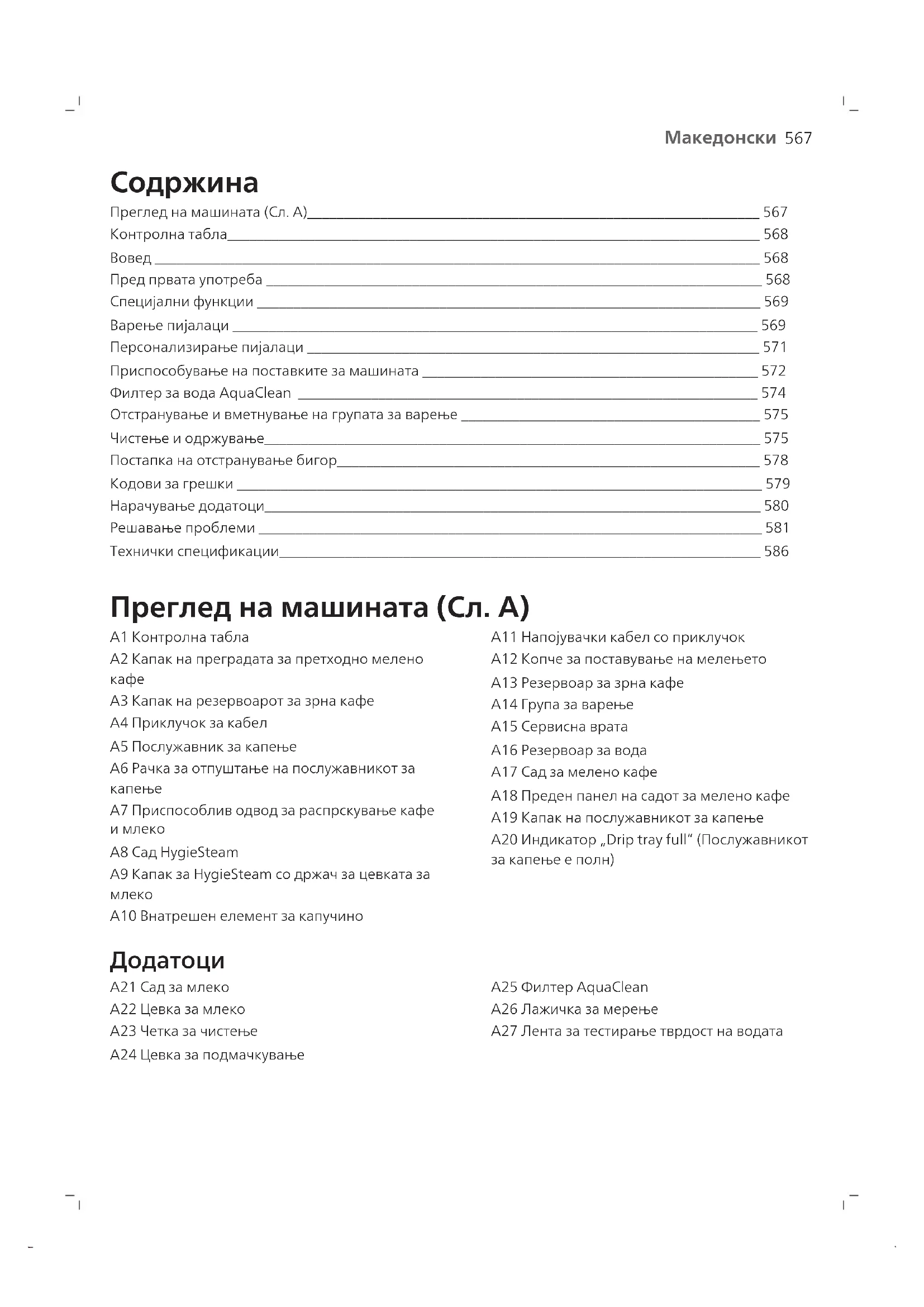 А21 Сад за млеко А22 Цевка за млеко A23 Четка за чистење A24 Цевка за подмачкување A25 Филтер AquaClean A26 Лажичка за мерење A27 Лента за тестирање тврдост на водата568