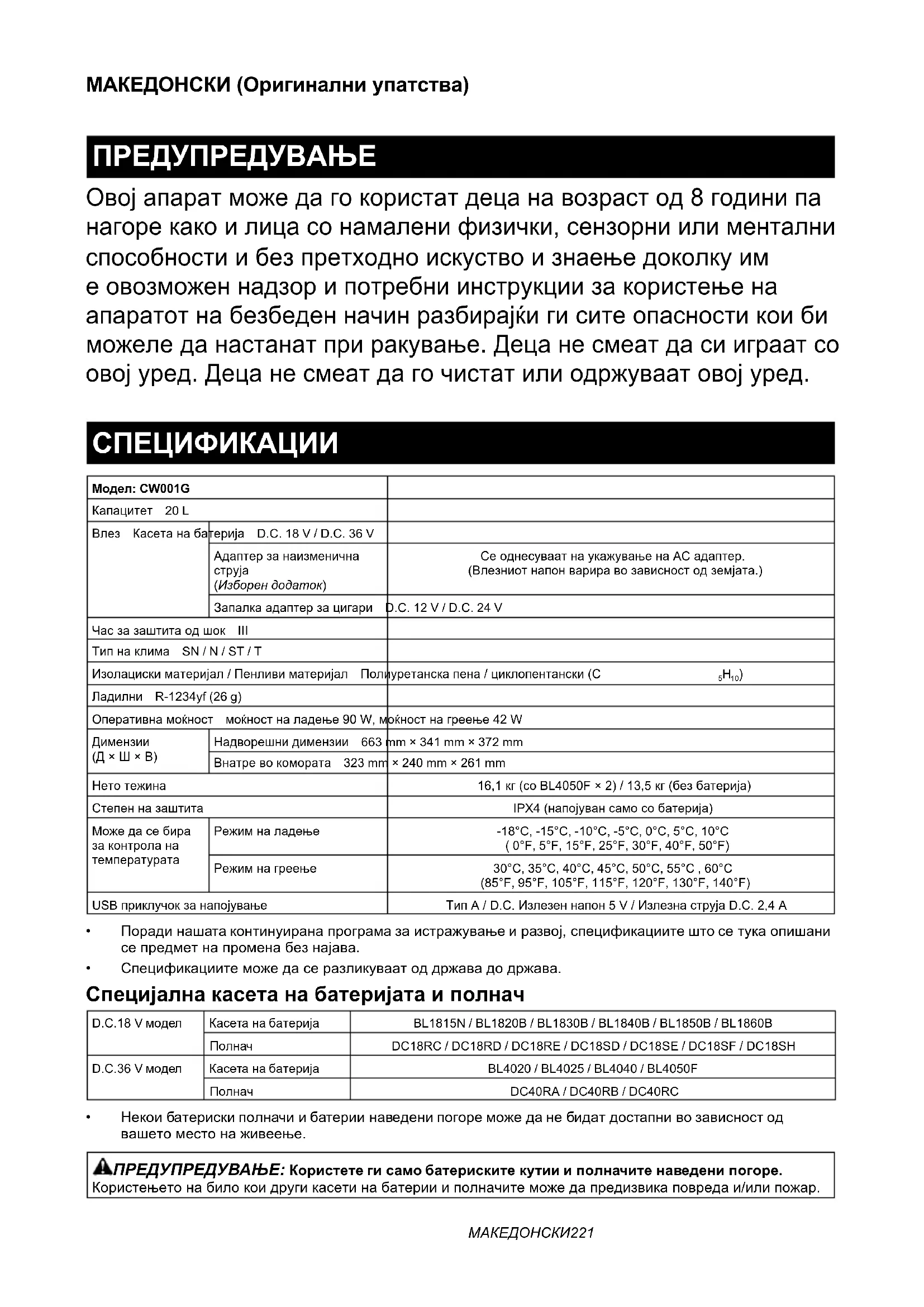 - OriginalnabaterijaipunjačMakita NAPOMENA:Nekestavkespopisamogubitiuklju- čeneupaketalatakaostandardnidodaci.Moguse razlikovatiodzemljedozemlje.МАКЕДОНСКИ221 МАКЕДОНСКИ (Оригинални упатства) ПРЕДУПРЕДУВАЊЕ Овојапаратможедагокористатдецанавозрастод8годинипа нагорекакоилицасонамаленифизички,сензорниилиментални способностиибезпретходноискуствоизнаењедоколкуим еовозможеннадзорипотребниинструкциизакористењена апаратотнабезбеденначинразбирајќигиситеопасностикоиби можеледанастанатприракување.Децанесмеатдасииграатсо овојуред.Децанесмеатдагочистатилиодржуваатовојуред. СПЕЦИФИКАЦИИ Модел: CW001GКапацитет 20 LВлез Касетанабатерија D.C. 18 V / D.C. 36 VАдаптерзанаизменичнаструја (Изборен додаток)СеоднесуваатнаукажувањенаACадаптер.(Влезниотнапонвариравозависностодземјата.)Запалкаадаптерзацигари D.C. 12 V / D.C. 24 VЧасзазаштитаодшок IIIТипнаклима SN / N / ST / TИзолацискиматеријал/Пенливиматеријал Полиуретанскапена/циклопентански(C