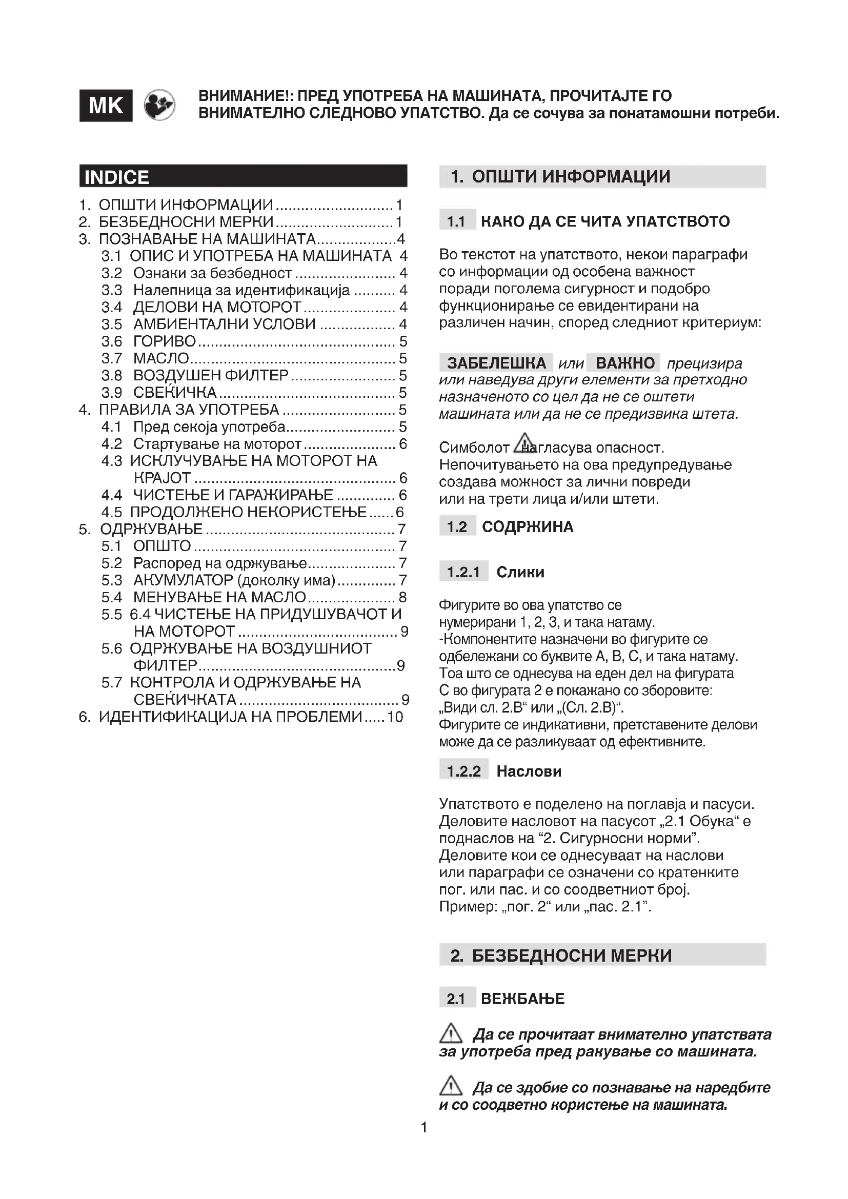 Оваа косилка користи мотор со внатрешно согорување. Моторот е инструмент чија изведба, регуларното функционирање и траење зависат од многу фактори надворешни и други, поврзани за квалитетот на користените производи и регуларноста на одржувањето. Во продолжетокот се изложени информации за поголема долготрајност на машината. Секоја различна употреба од горенаведената може да биде опасна и/или да предизвика штети на лица или предмети. ВАЖНО Со несоодветна употреба на машината се губи гаранцијата и се ослободува производителот од било какви трошоци за штети или повреди, лични или спрема трети лица.
