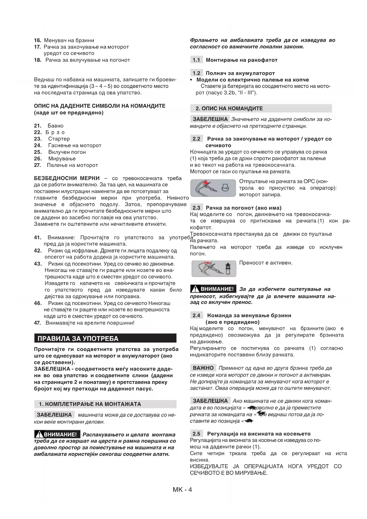 10) Застанете го уредот со сечивото ако тревокосачка- та треба да се закоси при транспорт, кога се поминува преку терени без трева и кога тревокосачката се носи кон теренот на кој треба да се коси и обратно. 11) Внимавајте на сообраќајот кога машината се кори- сти во близина на пат. 12) Не користете ја машината кога деловите се оштете- ни или ако нема вреќа за собирање, заштита за стра-MK - 2 ничниот испуст или заштита за задниот испуст. 13) Обрнете особено внимание во присуство на стрмнини, дупки или препреки. 14) Внимателно вклучете го моторот според упатство- то и држете ги нозете подалеку од уредот со сечивото. 15) Не закосувајте ја тревокосачката во движење. Вклучувајте ја на рамни површини, исчистени од пре- преки и висока трева. 16) Не приближувајте ги рацете или нозете до или под деловите што ротираат. Секогаш стојте оддалечено од отворот за празнење. 17) Не подигнувајте ја или не транспортирајте ја трево- косачката кога работи моторот. 18) Не преправајте или дезактивирајте ги безбеднос- ните системи. 19) Не менувајте ги регулациите на моторот и не кори- стете го при режим со превисоки вртежи. 20) Не допирајте ги компонентите на моторот коишто се загреале во текот на работата. Ризик од опекотини. 21) Кај моделите на погон, исклучете ја спојницата за пренос на тркалата пред да го вклучите моторот. 22) Секогаш користете дополнителна опрема одобре- на од производителот на машината. 23) Не користете ја машината ако дополнителната/по- мошната опрема не се поставени на дадените точки. 24) Исклучете го уредот со сечивото, застанете го мо- торот и извадете го кабелот за свеќичката (внимавајќи при тоа сите делови во движење да бидат застанати