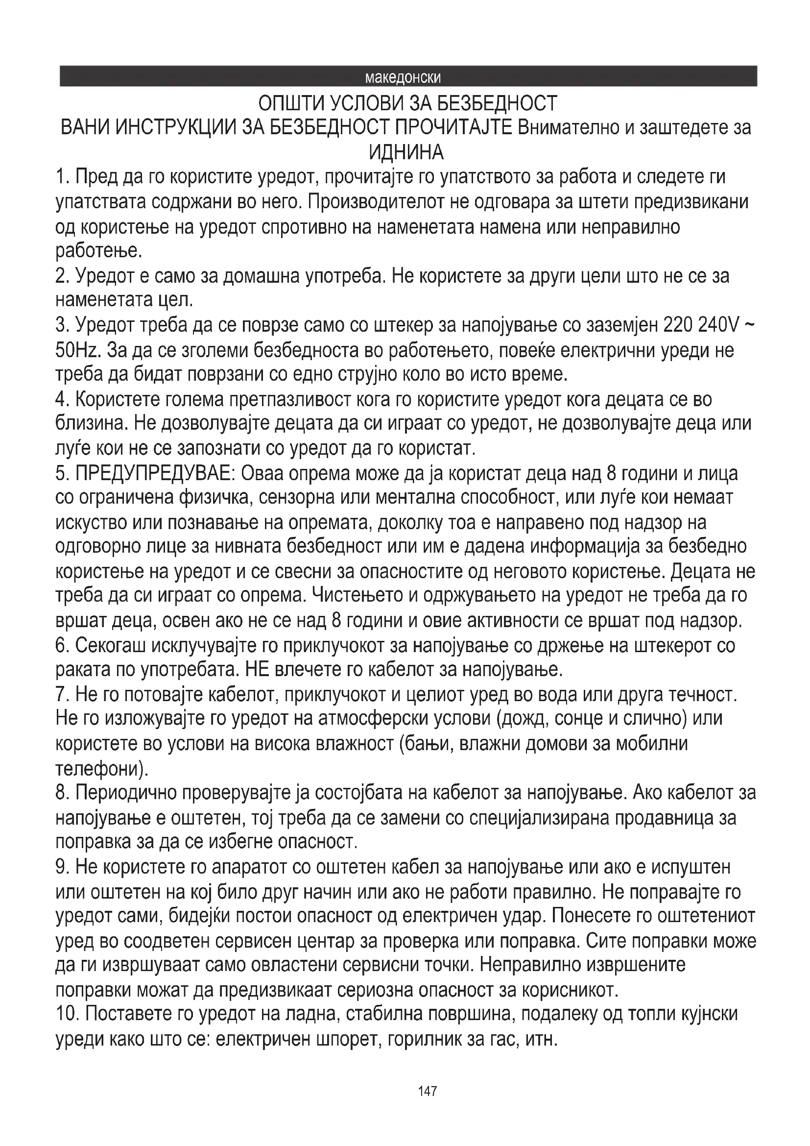9. Не користете го апаратот со оштетен кабел за напојување или ако е испуштен
