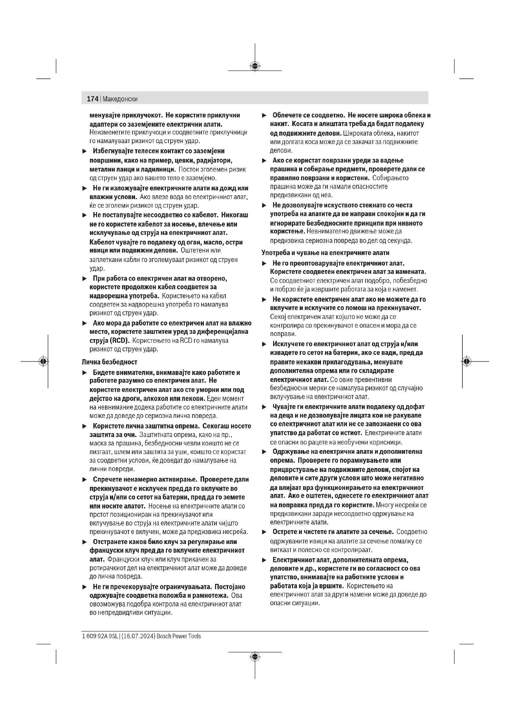 u Исклучете го електричниот алат од струја и/или извадете го сетот на батерии, ако се вади, пред да правите некакви прилагодувања, менувате дополнителна опрема или го складирате електричниот алат. Со овие превентивни безбедносни мерки се намалува ризикот од случајно вклучување на електричниот алат. u Чувајте ги електричните алати подалеку од дофат на деца и не дозволувајте лицата кои не ракувале со електричниот алат или не се запознаени со ова упатство да работат со истиот. Електричните алати се опасни во рацете на необучени корисници. u Одржување на електрични алати и дополнителна опрема. Проверете го порамнувањето или прицврстување на подвижните делови, спојот на деловите и сите други услови што може негативно да влијаат врз функционирањето на електричниот алат. Ако е оштетен, однесете го електричниот алат на поправка пред да го користите. Многу несреќи се предизвикани заради несоодветно одржување на електричните алати. u Острете и чистете ги алатите за сечење. Соодветно одржуваните ивици на алатите за сечење помалку се виткаат и полесно се контролираат. u Електричниот алат, дополнителната опрема, деловите и др., користете ги во согласност со ова упатство, внимавајте на работните услови и работата која ја вршите. Користењето на електричниот алат за други намени може да доведе до опасни ситуации. 1 609 92A 9SL | (16.07.2024) Bosch Power ToolsМакедонски | 175 u Рачките и површините за држење одржувајте ги суви, чисти и неизмастени. Рачките и површините за држење што се лизгаат не овозможуваат безбедно ракување и контрола на алатот во непредвидливи