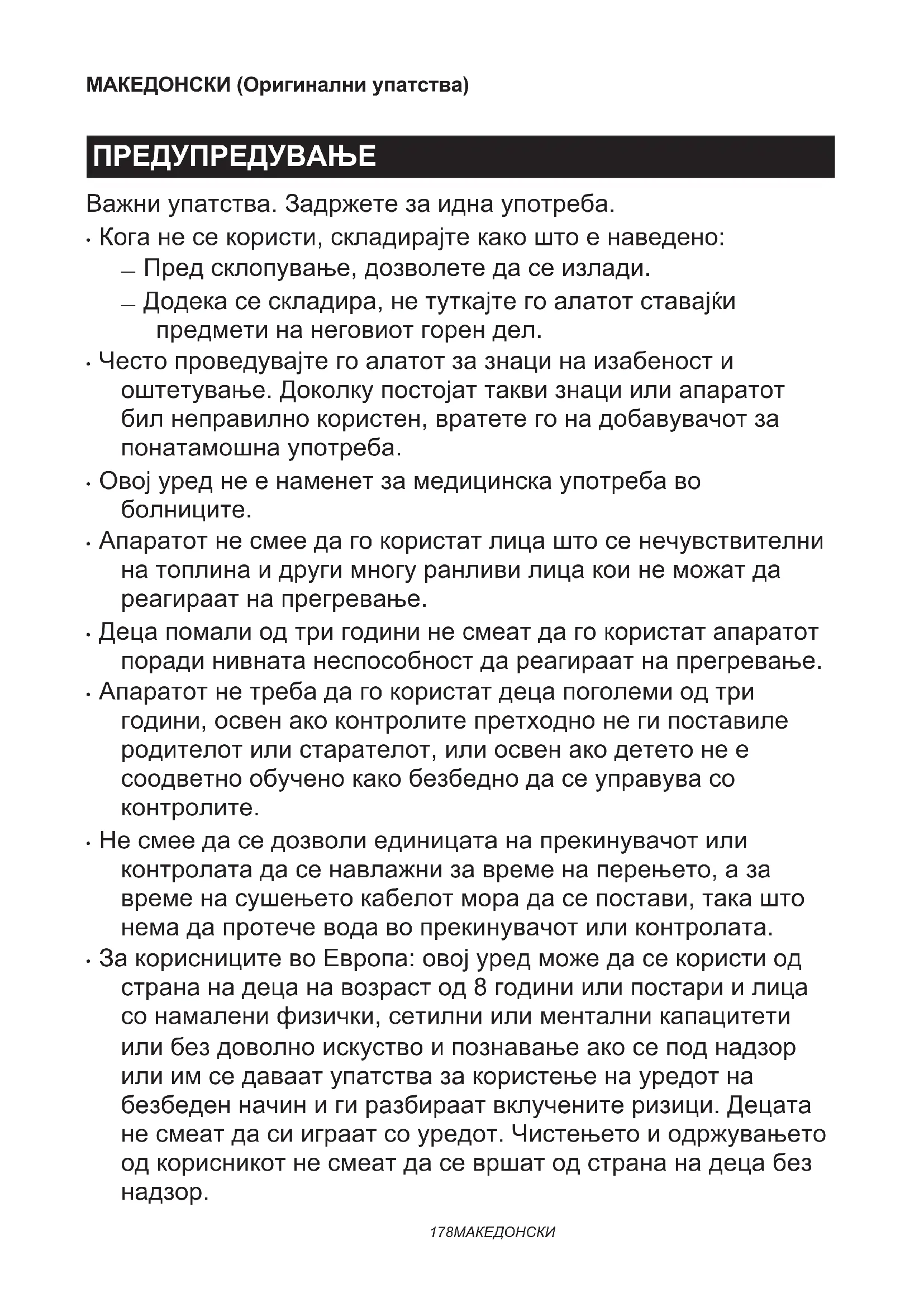 - За корисниците во Европа: овој уред може да се користи од страна на деца на возраст од 8 години или постари и лица со намалени физички, сетилни или ментални капацитети или без доволно искуство и познавање ако се под надзор или им се даваат упатства за користење на уредот на безбеден начин и ги разбираат вклучените ризици. Децата не смеат да си играат со уредот. Чистењето и одржувањето од корисникот не смеат да се вршат од страна на деца без надзор.179 МАКЕДОНСКИ