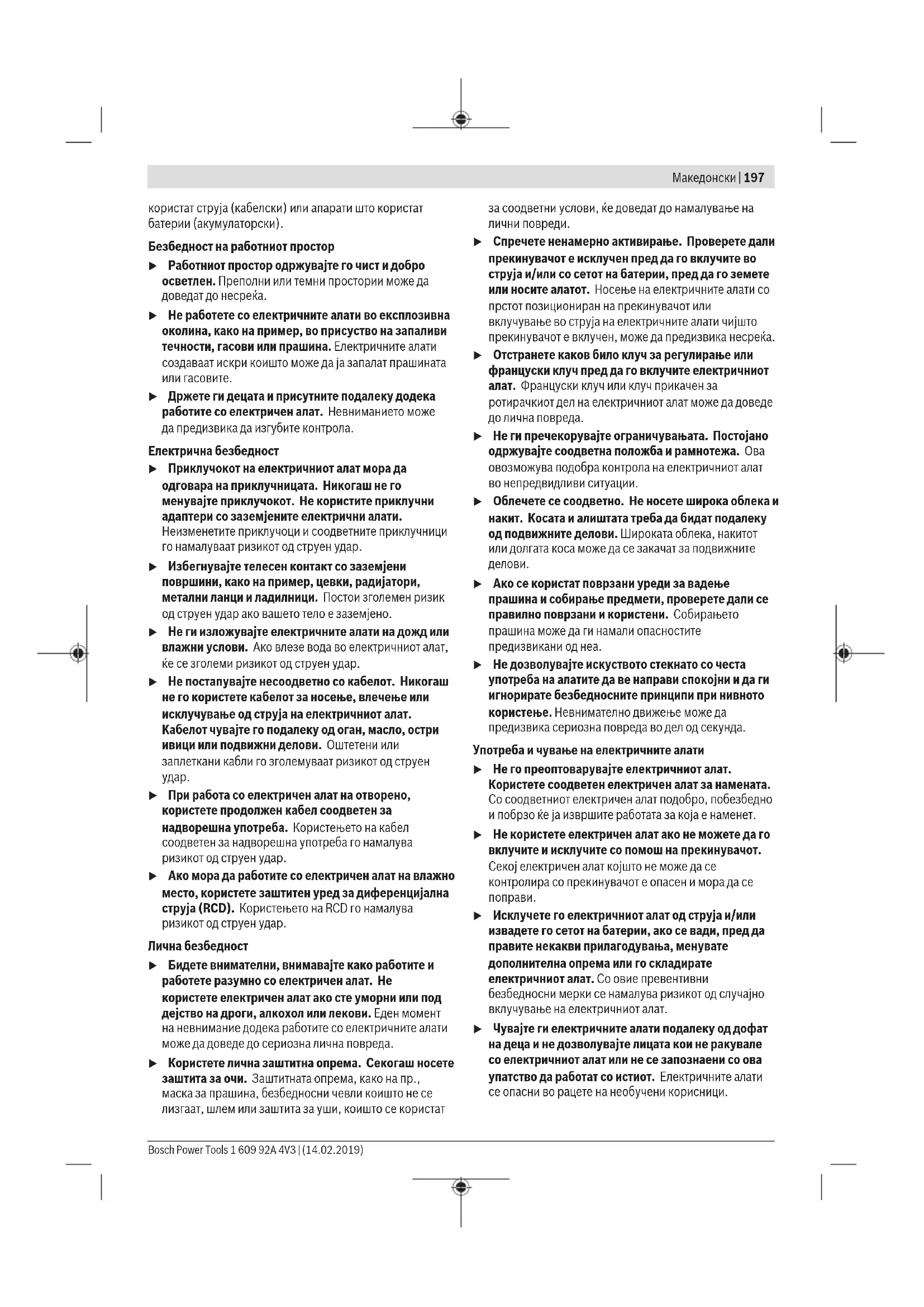 Прочитајте ги сите безбедносни предупредувања, илустрации и спецификации приложени со овој електричен алат. Непридржувањето до сите упатства приложени подолу може да доведе до струен удар, пожар и/или тешки повреди. Зачувајте ги безбедносните предупредувања и упатства за користење и за во иднина. Поимот „електричен алат“ во безбедносните предупредувања се однесува на електрични апарати што 1 609 92A 4V3 | (14.02.2019) Bosch Power ToolsМакедонски | 197 користат струја (кабелски) или апарати што користат батерии (акумулаторски). Безбедност на работниот простор u Работниот простор одржувајте го чист и добро осветлен. Преполни или темни простории може да доведат до несреќа. u Не работете со електричните алати во експлозивна околина, како на пример, во присуство на запаливи течности, гасови или прашина. Електричните алати создаваат искри коишто може да ја запалат прашината или гасовите. u Држете ги децата и присутните подалеку додека работите со електричен алат. Невниманието може да предизвика да изгубите контрола. Електрична безбедност u Приклучокот на електричниот алат мора да одговара на приклучницата. Никогаш не го менувајте приклучокот. Не користите приклучни адаптери со заземјените електрични алати. Неизменетите приклучоци и соодветните приклучници го намалуваат ризикот од струен удар. u Избегнувајте телесен контакт со заземјени површини, како на пример, цевки, радијатори, метални ланци и ладилници. Постои зголемен ризик од струен удар ако вашето тело е заземјено. u Не ги изложувајте електричните алати на дожд или влажни услови. Ако влезе вода во електричниот алат, ќе се зголеми ризикот од струен удар. u Не постапувајте несоодветно со кабелот. Никогаш не го користете кабелот за носење, влечење или исклучување од струја на електричниот алат. Кабелот чувајте го подалеку од оган, масло, остри ивици или подвижни делови. Оштетени или заплеткани кабли го зголемуваат ризикот од струен
