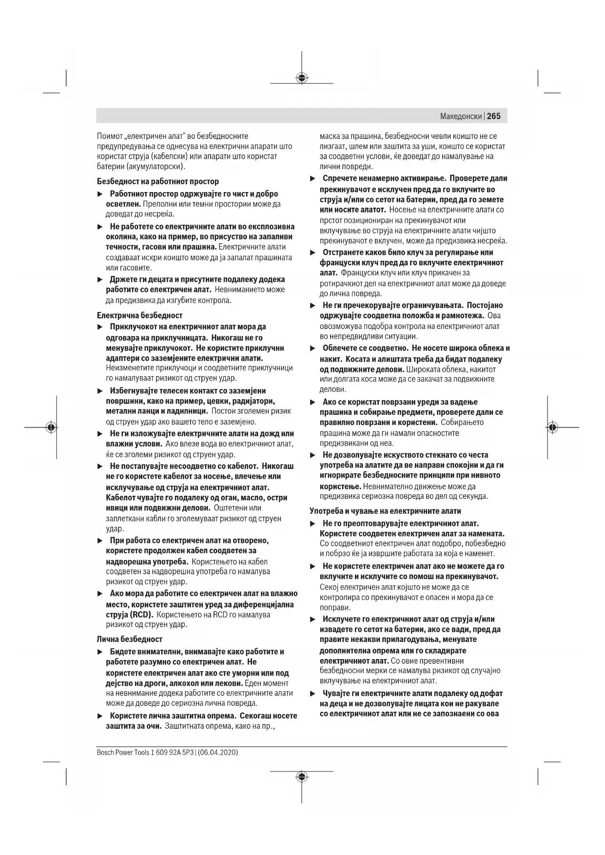 Прочитајте ги сите безбедносни предупредувања, илустрации и спецификации приложени со овој електричен алат. Непридржувањето до сите упатства приложени подолу може да доведе до струен удар, пожар и/или тешки повреди. Зачувајте ги безбедносните предупредувања и упатства за користење и за во иднина. 1 609 92A 5P3 | (06.04.2020) Bosch Power ToolsМакедонски | 265 Поимот „електричен алат“ во безбедносните предупредувања се однесува на електрични апарати што користат струја (кабелски) или апарати што користат батерии (акумулаторски). Безбедност на работниот простор u Работниот простор одржувајте го чист и добро осветлен. Преполни или темни простории може да доведат до несреќа. u Не работете со електричните алати во експлозивна околина, како на пример, во присуство на запаливи течности, гасови или прашина. Електричните алати создаваат искри коишто може да ја запалат прашината или гасовите. u Држете ги децата и присутните подалеку додека работите со електричен алат. Невниманието може да предизвика да изгубите контрола. Електрична безбедност u Приклучокот на електричниот алат мора да одговара на приклучницата. Никогаш не го менувајте приклучокот. Не користите приклучни адаптери со заземјените електрични алати. Неизменетите приклучоци и соодветните приклучници го намалуваат ризикот од струен удар. u Избегнувајте телесен контакт со заземјени површини, како на пример, цевки, радијатори, метални ланци и ладилници. Постои зголемен ризик од струен удар ако вашето тело е заземјено. u Не ги изложувајте електричните алати на дожд или влажни услови. Ако влезе вода во електричниот алат, ќе се зголеми ризикот од струен удар. u Не постапувајте несоодветно со кабелот. Никогаш не го користете кабелот за носење, влечење или исклучување од струја на електричниот алат. Кабелот чувајте го подалеку од оган, масло, остри ивици или подвижни делови. Оштетени или заплеткани кабли го зголемуваат ризикот од струен