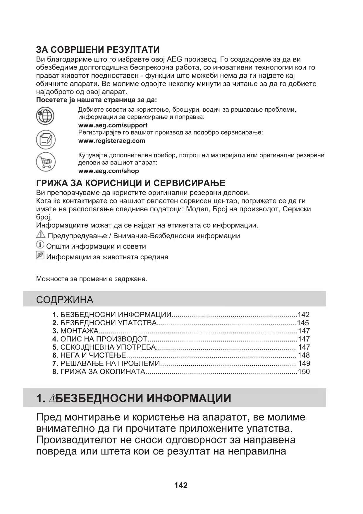 Nododiet otrreizējai pārstrādei materiālus ar simbolu . Ievietojiet iepakojuma materiālus atbilstošajos konteineros to otrreizējai pārstrādei. Palīdziet aizsargāt apkārtējo vidi un cilvēku veselību, atkārtoti pārstrādājot elektrisko un elektronisko iekārtu atkritumus. Neizmetiet ierīces, kas apzīmētas ar šo simbolu , kopā ar mājsaimniecības atkritumiem. Nododiet izstrādājumu vietējā otrreizējās pārstrādes punktā vai sazinieties ar vietējo pašvaldību. 141ЗА СОВРШЕНИ РЕЗУЛТАТИ Ви благодариме што го избравте овој AEG производ. Го создадовме за да виобезбедиме долгогодишна беспрекорна работа, со иновативни технологии кои гоправат животот поедноставен - функции што можеби нема да ги најдете кајобичните апарати. Ве молиме одвојте неколку минути за читање за да го добиетенајдоброто од овој апарат.Посетете ја нашата страница за да:Добиете совети за користење, брошури, водич за решавање проблеми,информации за сервисирање и поправка:www.aeg.com/supportРегистрирајте го вашиот производ за подобро сервисирање:www.registeraeg.comКупувајте дополнителен прибор, потрошни материјали или оригинални резервниделови за вашиот апарат:www.aeg.com/shop ГРИЖА ЗА КОРИСНИЦИ И СЕРВИСИРАЊЕ Ви препорачуваме да користите оригинални резервни делови.Кога ќе контактирате со нашиот овластен сервисен центар, погрижете се да гиимате на располагање следниве податоци: Модел, Број на производот, Серискиброј.Информациите можат да се најдат на етикетата со информации. Предупредување / Внимание-Безбедносни информации Општи информации и совети Информации за животната срединаМожноста за промени е задржана. 1. БЕЗБЕДНОСНИ ИНФОРМАЦИИ..............................................................1422. БЕЗБЕДНОСНИ УПАТСТВА.....................................................................145