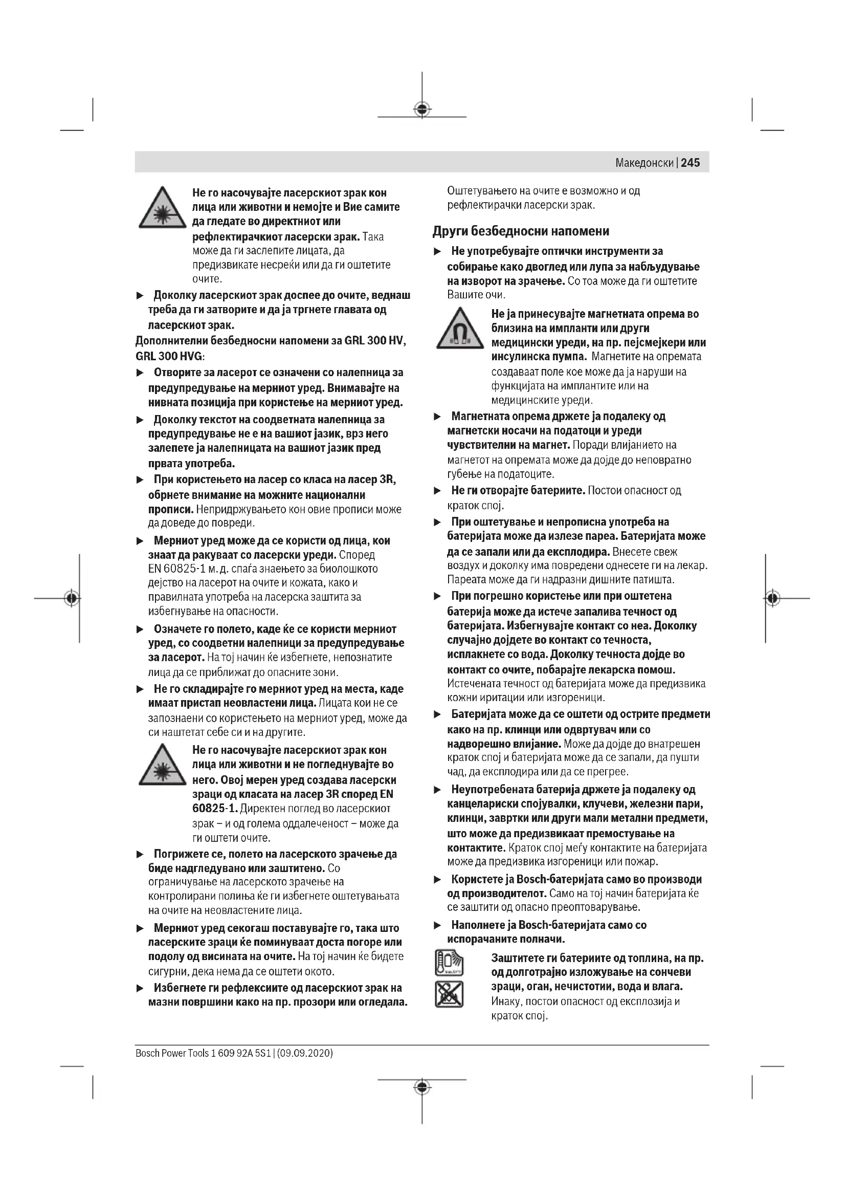 Класа на ласер 2 3R 3R Bosch Power Tools 1 609 92A 5S1 | (09.09.2020)248 | Македонски Ротационен ласер GRL250HV GRL300HV GRL300HVG Тип на ласер 635nm, <1mW 635nm, <5mW 532nm, <5mW Отстапување 0,4mrad (целосен