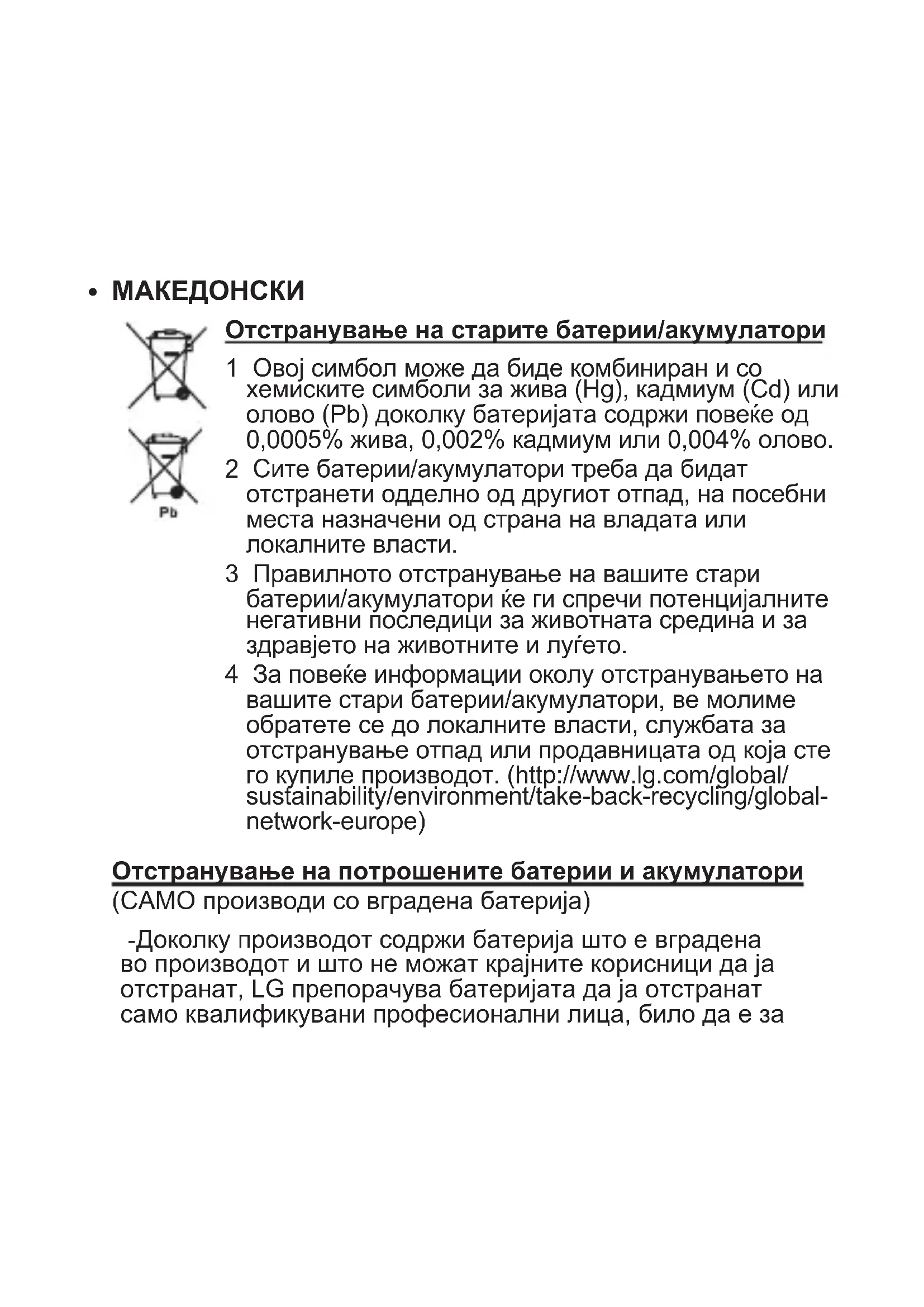 1 Ce symbole peut être associé aux symboles chimiques du mercure (Hg), du cadmium (Cd) ou du plomb (Pb) si la batterie contient plus de 0,0005 % de mercure, 0,002 % de cadmium ou 0,004 % de plomb. 2 Les batteries/accumulateurs doivent être jetés séparément, dans les déchetteries prévues à cet effet par votre municipalité ou être rapportés dans un magasin de téléphonie mobile. 3 La mise au rebut de vos batteries/accumulateurs dans une poubelle appropriée ou dans un magasin de téléphonie mobile aidera à réduire les risques pour l'environnement et votre santé. 4 Pour plus d'informations concernant le recyclage de vos batteries/accumulateurs, veuillez contacter votre mairie, le service des ordures ménagères ou encore le magasin où vous avez acheté ce produit. (http://www/lg.com/global/sustainability/environment/take-back-recycling/global-network-europe)