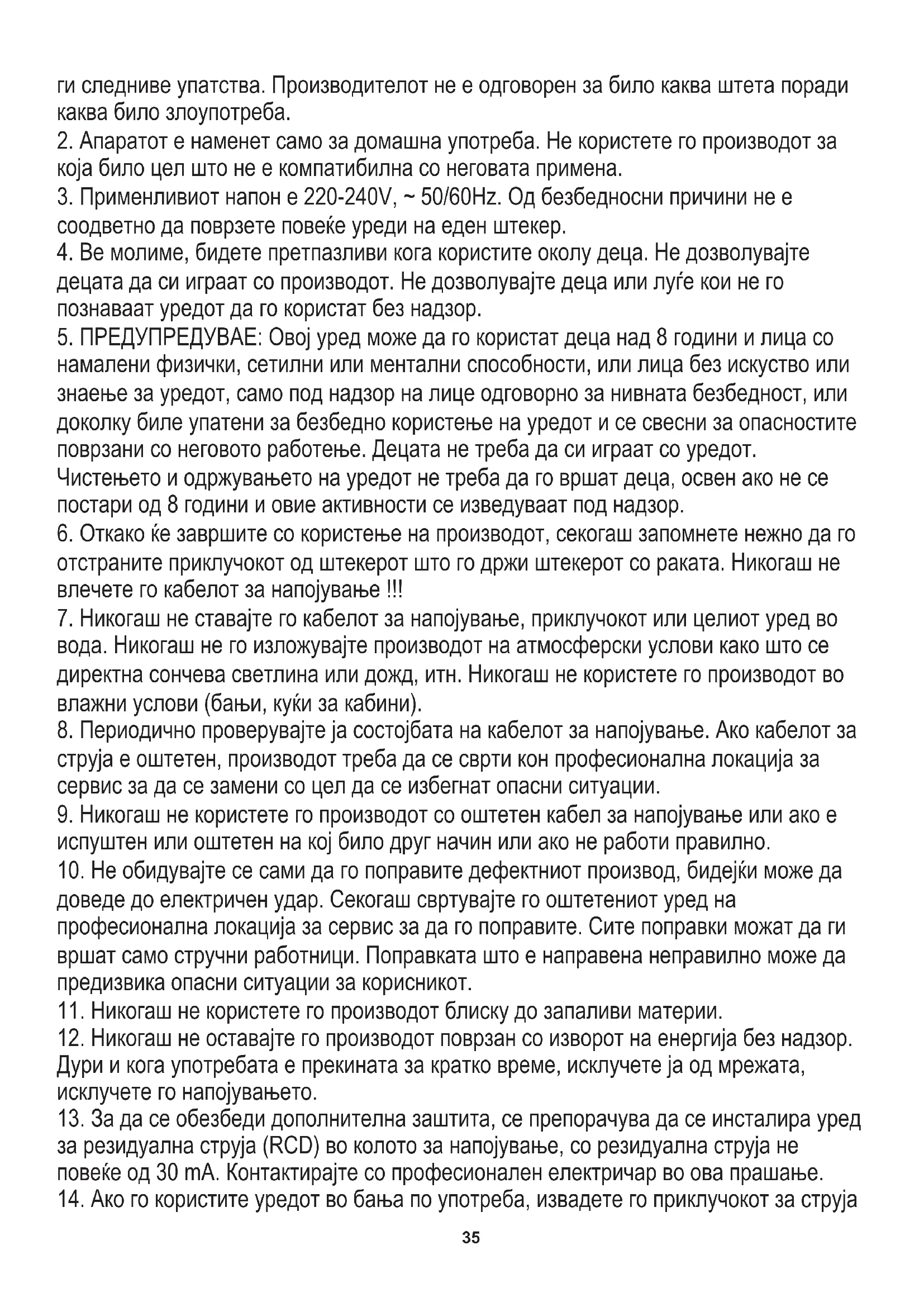 3. Применливиот напон е 220-240V, ~ 50/60Hz. Од безбедносни причини не е