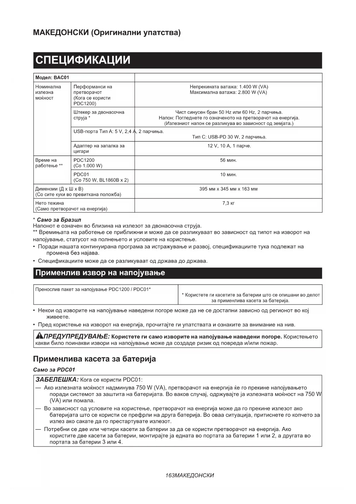 - Спецификациите може да се разликуваат од држава до држава. Применлив извор на напојување Пренослив пакет за напојување PDC1200 / PDC01*