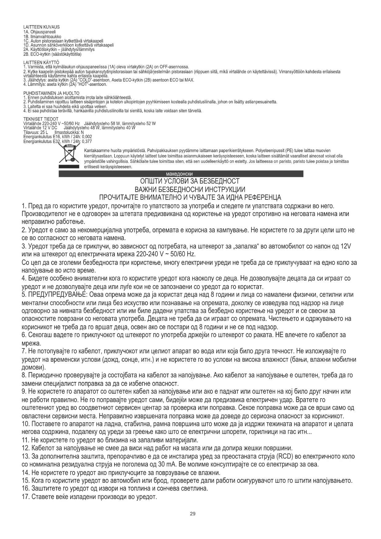ТЕХНИЧКИ ПОДАТОЦИ Напојување 220-240 V ~ 50/60 Hz Моќност 58 W за ладење, 52 W греење Моќност од 12 V DC Моќност од 48 W, греење од 40 W Капацитет: 25 L Климатска класа: N Потрошувачка на енергија E16, kWh / 24h: 0,002 Потрошувачка на енергија E32, kWh / 24h: 0,37731
