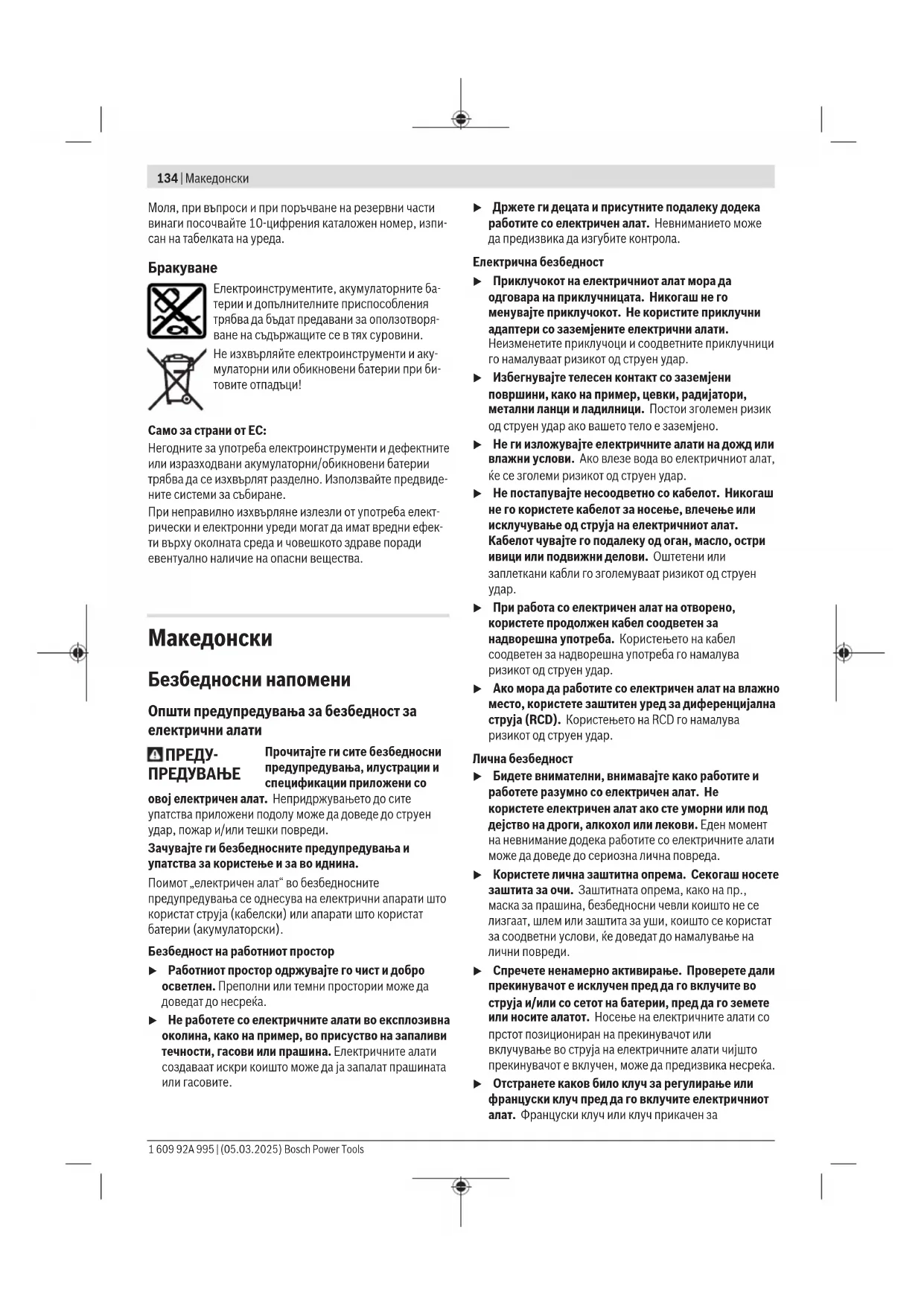 u При работа со електричен алат на отворено, користете продолжен кабел соодветен за надворешна употреба. Користењето на кабел соодветен за надворешна употреба го намалува ризикот од струен удар. u Ако мора да работите со електричен алат на влажно место, користете заштитен уред за диференцијална струја (RCD). Користењето на RCD го намалува ризикот од струен удар. Лична безбедност u Бидете внимателни, внимавајте како работите и работете разумно со електричен алат. Не користете електричен алат ако сте уморни или под дејство на дроги, алкохол или лекови. Еден момент на невнимание додека работите со електричните алати може да доведе до сериозна лична повреда. u Користете лична заштитна опрема. Секогаш носете заштита за очи. Заштитната опрема, како на пр., маска за прашина, безбедносни чевли коишто не се лизгаат, шлем или заштита за уши, коишто се користат за соодветни услови, ќе доведат до намалување на лични повреди. u Спречете ненамерно активирање. Проверете дали прекинувачот е исклучен пред да го вклучите во струја и/или со сетот на батерии, пред да го земете или носите алатот. Носење на електричните алати со прстот позициониран на прекинувачот или вклучување во струја на електричните алати чијшто прекинувачот е вклучен, може да предизвика несреќа. u Отстранете каков било клуч за регулирање или француски клуч пред да го вклучите електричниот алат. Француски клуч или клуч прикачен за 1 609 92A 995 | (05.03.2025) Bosch Power ToolsМакедонски | 135 ротирачкиот дел на електричниот алат може да доведе до лична повреда. u Не ги пречекорувајте ограничувањата. Постојано одржувајте соодветна положба и рамнотежа. Ова овозможува подобра контрола на електричниот алат во непредвидливи ситуации. u Облечете се соодветно. Не носете широка облека и накит. Косата и алиштата треба да бидат подалеку од подвижните делови. Широката облека, накитот или долгата коса може да се закачат за подвижните