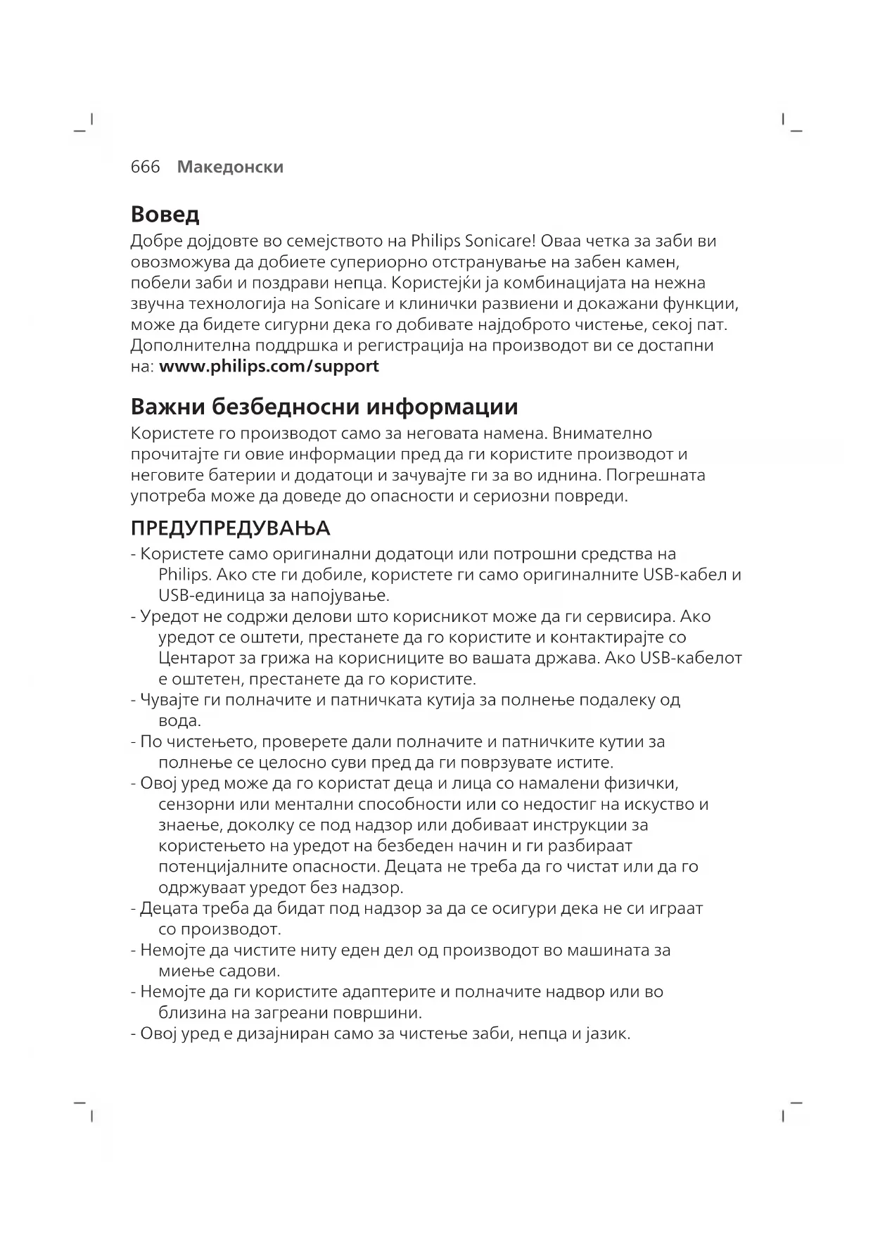 Добре дојдовте во семејството на Philips Sonicare! Оваа четка за заби ви овозможува да добиете супериорно отстранување на забен камен, побели заби и поздрави непца. Користејќи ја комбинацијата на нежна звучна технологија на Sonicare и клинички развиени и докажани функции, може да бидете сигурни дека го добивате најдоброто чистење, секој пат. Дополнителна поддршка и регистрација на производот ви се достапни на: www.philips.com/support Важни безбедносни информации Користете го производот само за неговата намена. Внимателно прочитајте ги овие информации пред да ги користите производот и неговите батерии и додатоци и зачувајте ги за во иднина. Погрешната употреба може да доведе до опасности и сериозни повреди. ПРЕДУПРЕДУВАЊА - Користете само оригинални додатоци или потрошни средства на Philips. Ако сте ги добиле, користете ги само оригиналните USB-кабел и USB-единица за напојување. - Уредот не содржи делови што корисникот може да ги сервисира. Ако уредот се оштети, престанете да го користите и контактирајте со Центарот за грижа на корисниците во вашата држава. Ако USB-кабелот е оштетен, престанете да го користите. - Чувајте ги полначите и патничката кутија за полнење подалеку од