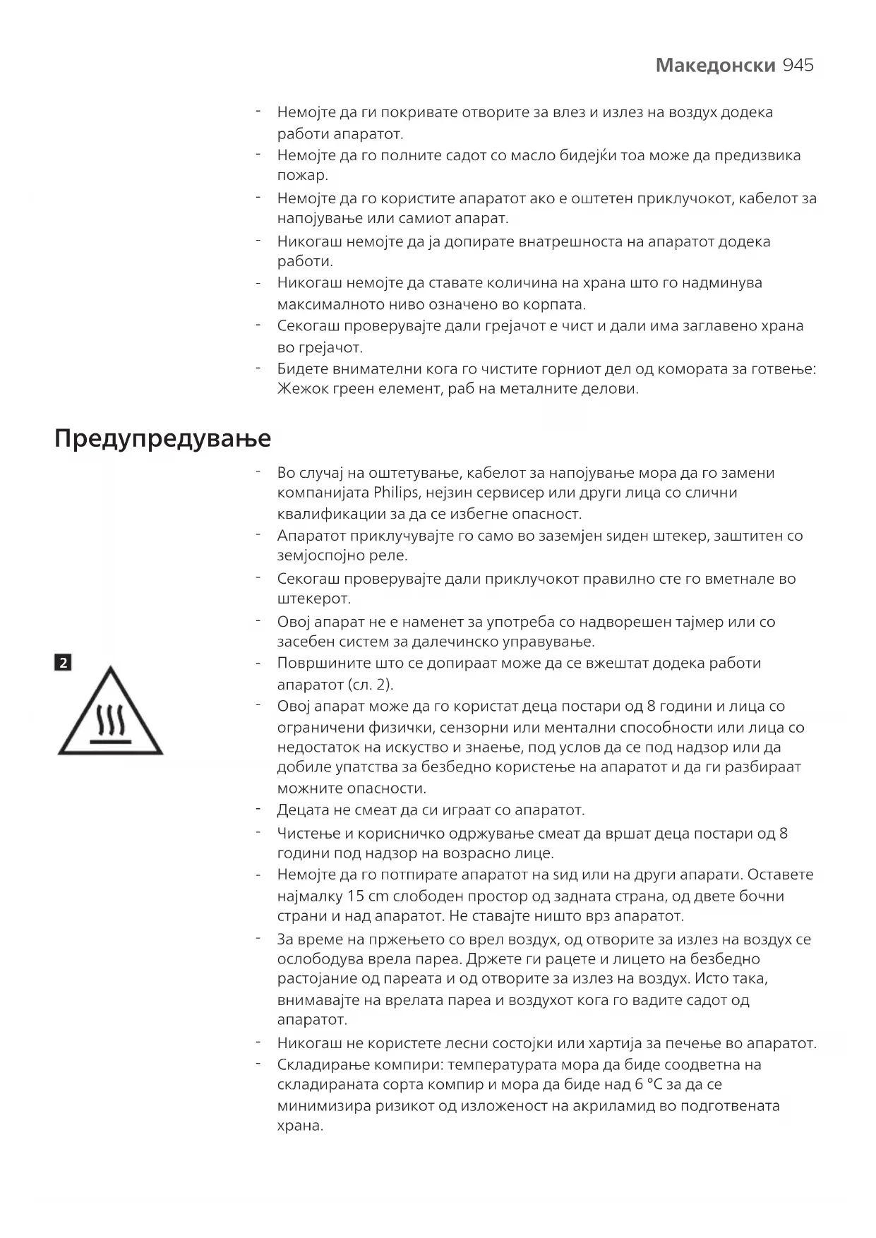 Состојките за пржење секогаш ставајте ги во корпата за да не дојдат во допир со грејните елементи.945