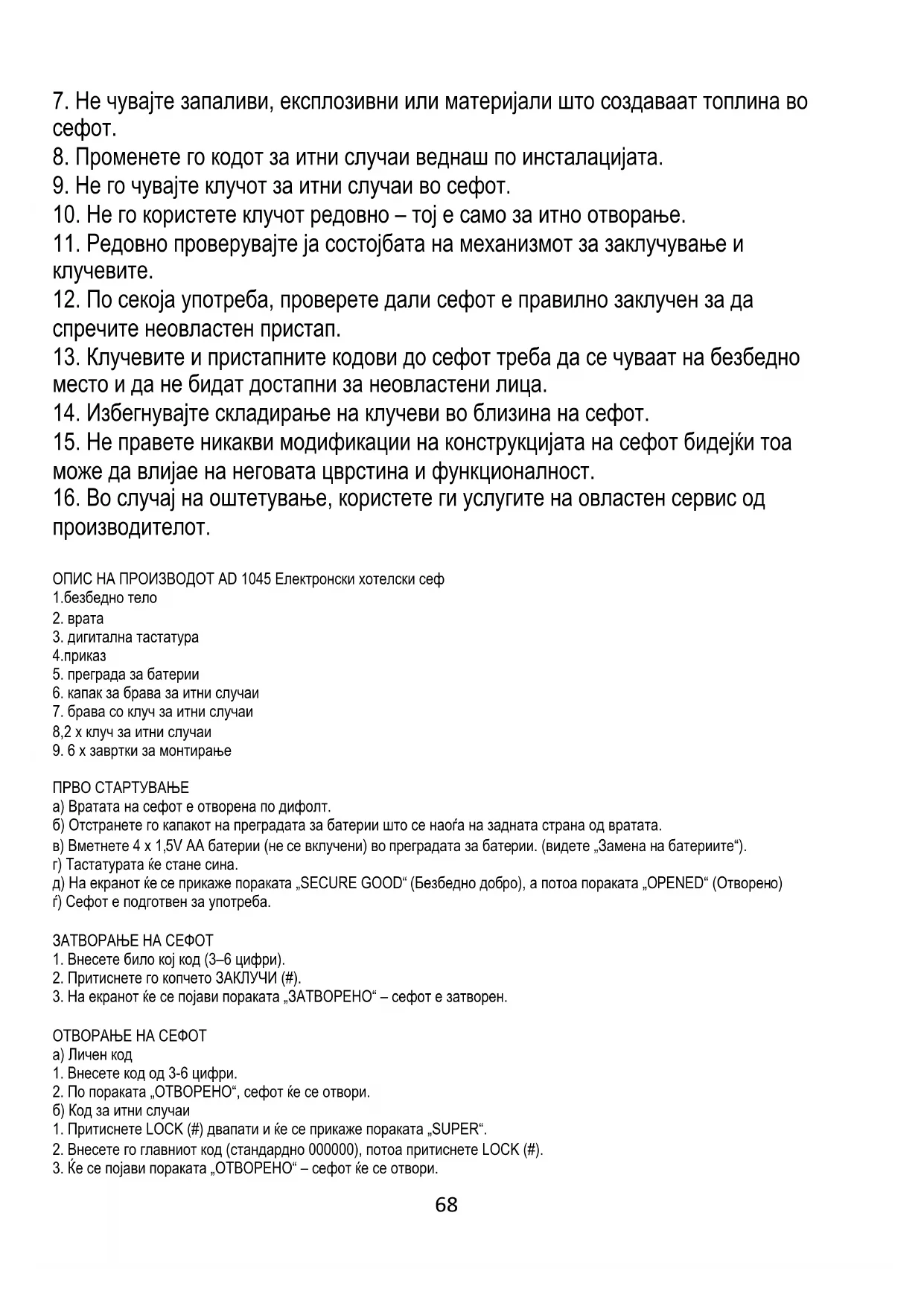 производителот. ОПИС НА ПРОИЗВОДОТ AD 1045 Електронски хотелски сеф 1.безбедно тело