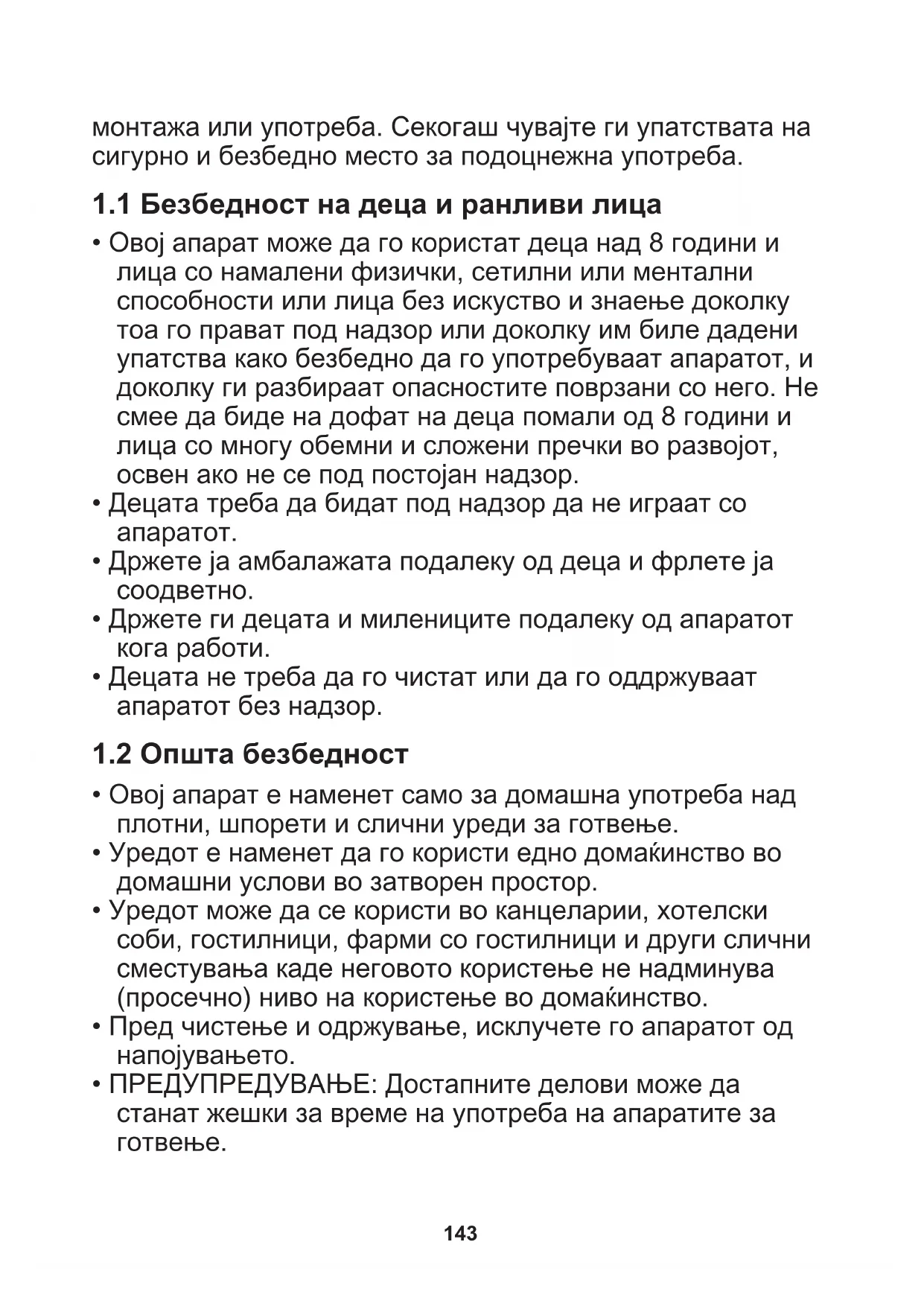- Овој апарат може да го користат деца над 8 години и лица со намалени физички, сетилни или ментални способности или лица без искуство и знаење доколку тоа го прават под надзор или доколку им биле дадени упатства како безбедно да го употребуваат апаратот, и доколку ги разбираат опасностите поврзани со него. Не смее да биде на дофат на деца помали од 8 години и лица со многу обемни и сложени пречки во развојот, освен ако не се под постојан надзор.