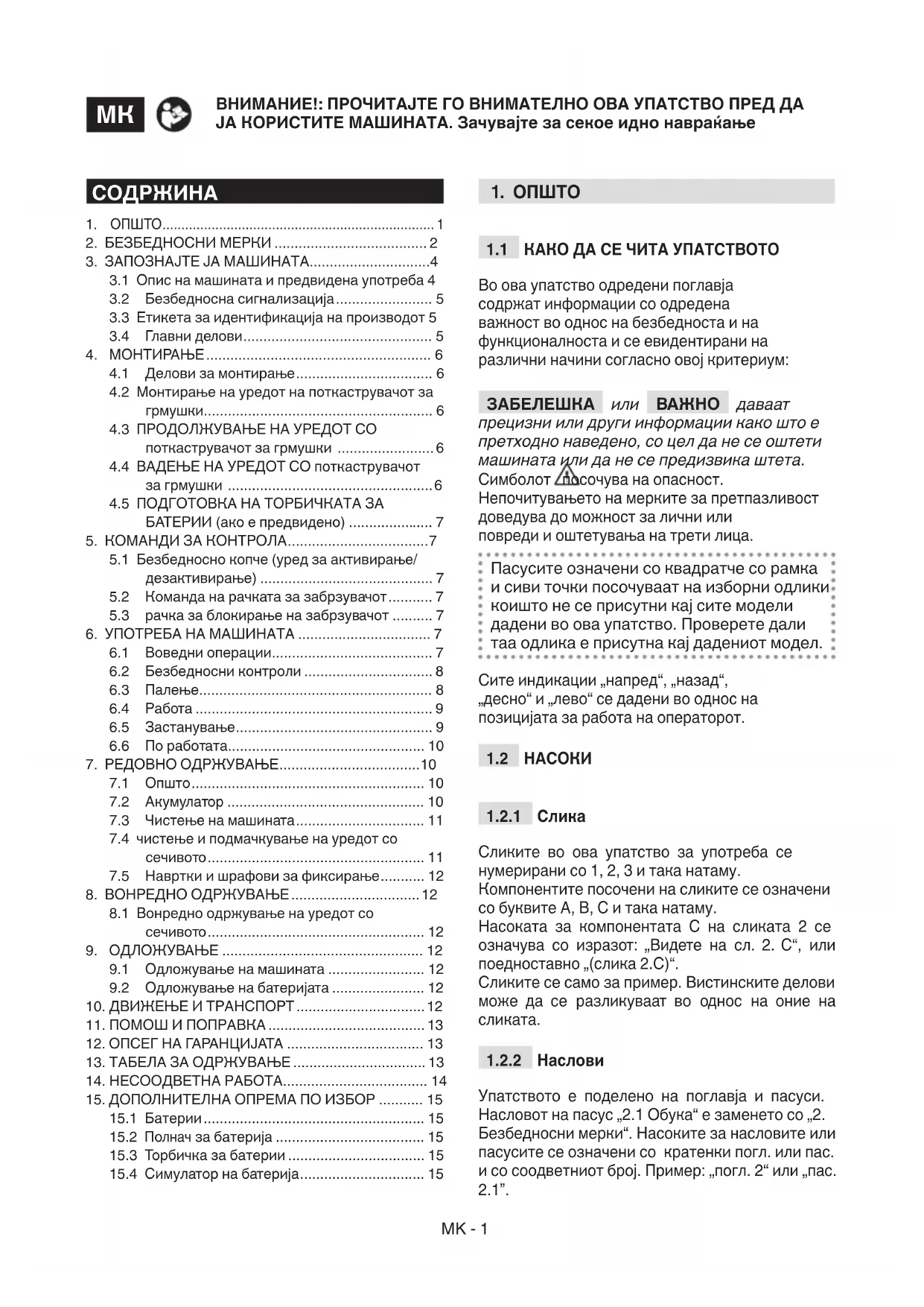 Во ова упатство одредени поглавја содржат информации со одредена важност во однос на безбедноста и на функционалноста и се евидентирани на различни начини согласно овој критериум: ЗАБЕЛЕШКА или ВАЖНО даваат прецизни или други информации како што е претходно наведено, со цел да не се оштети машината или да не се предизвика штета. Симболот посочува на опасност. Непочитувањето на мерките за претпазливост доведува до можност за лични или повреди и оштетувања на трети лица. Пасусите означени со квадратче со рамка и сиви точки посочуваат на изборни одлики коишто не се присутни кај сите модели дадени во ова упатство. Проверете дали таа одлика е присутна кај дадениот модел. Сите индикации „напред“, „назад“, „десно“ и „лево“ се дадени во однос на позицијата за работа на операторот.