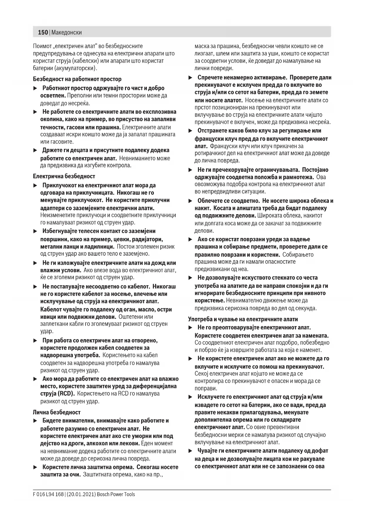 Прочитајте ги сите безбедносни предупредувања, илустрации и спецификации приложени со овој електричен алат. Непридржувањето до сите упатства приложени подолу може да доведе до струен удар, пожар и/или тешки повреди. Зачувајте ги безбедносните предупредувања и упатства за користење и за во иднина. Bosch Power Tools F 016 L94 168 | (20.01.2021)150 | Македонски Поимот „електричен алат“ во безбедносните предупредувања се однесува на електрични апарати што користат струја (кабелски) или апарати што користат батерии (акумулаторски). Безбедност на работниот простор u Работниот простор одржувајте го чист и добро осветлен. Преполни или темни простории може да доведат до несреќа. u Не работете со електричните алати во експлозивна околина, како на пример, во присуство на запаливи течности, гасови или прашина. Електричните алати создаваат искри коишто може да ја запалат прашината или гасовите. u Држете ги децата и присутните подалеку додека работите со електричен алат. Невниманието може да предизвика да изгубите контрола. Електрична безбедност u Приклучокот на електричниот алат мора да одговара на приклучницата. Никогаш не го менувајте приклучокот. Не користите приклучни адаптери со заземјените електрични алати. Неизменетите приклучоци и соодветните приклучници го намалуваат ризикот од струен удар. u Избегнувајте телесен контакт со заземјени површини, како на пример, цевки, радијатори, метални ланци и ладилници. Постои зголемен ризик од струен удар ако вашето тело е заземјено. u Не ги изложувајте електричните алати на дожд или влажни услови. Ако влезе вода во електричниот алат, ќе се зголеми ризикот од струен удар. u Не постапувајте несоодветно со кабелот. Никогаш не го користете кабелот за носење, влечење или исклучување од струја на електричниот алат. Кабелот чувајте го подалеку од оган, масло, остри ивици или подвижни делови. Оштетени или заплеткани кабли го зголемуваат ризикот од струен